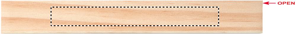 12-teiliges Schreibset in einer Holzbox (2 Bleistifte, 6 Buntstifte, Spitzer, Radierer, Lineal in cm und Inch). Das Lineal dient auch als Deckel.