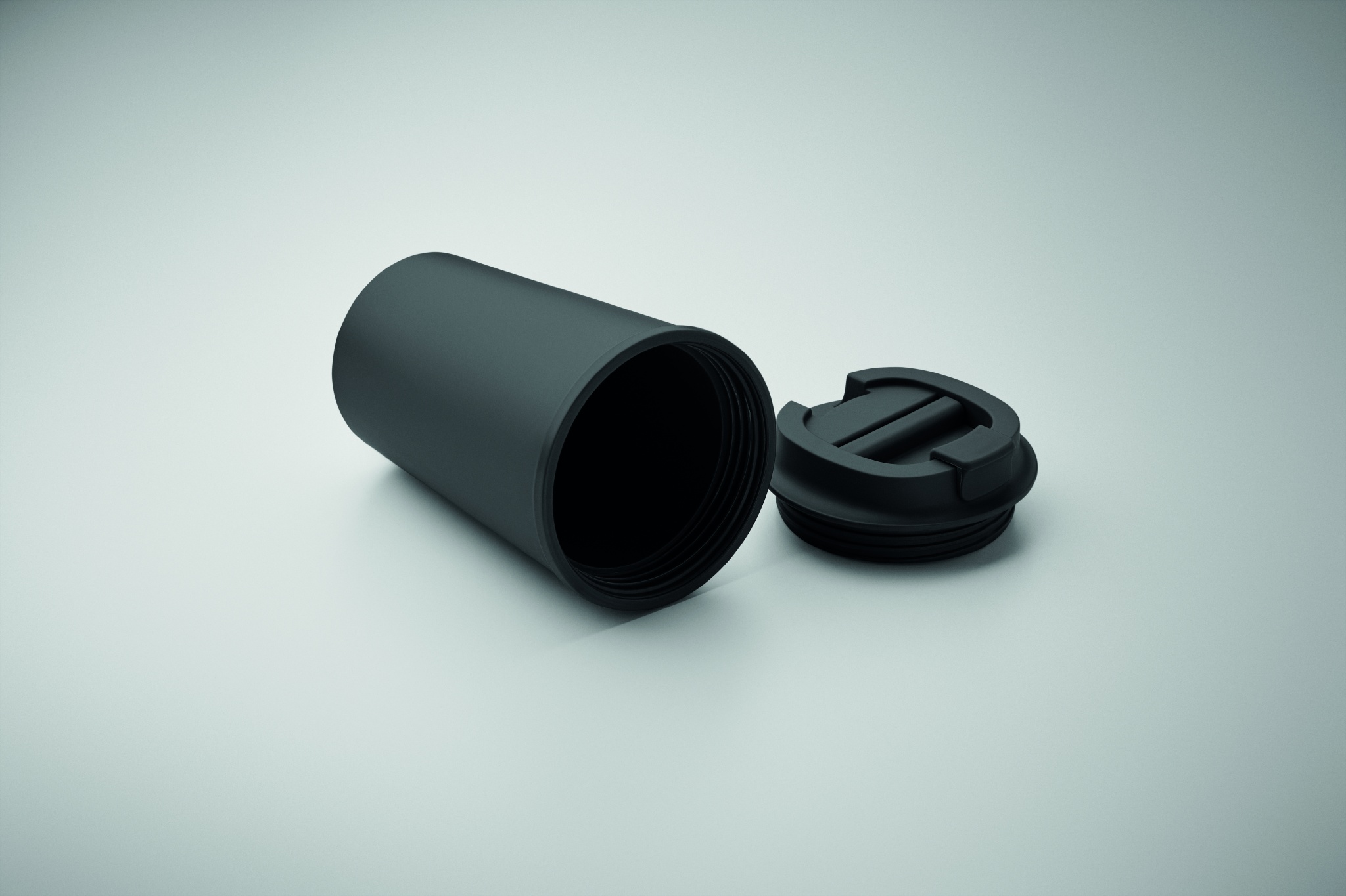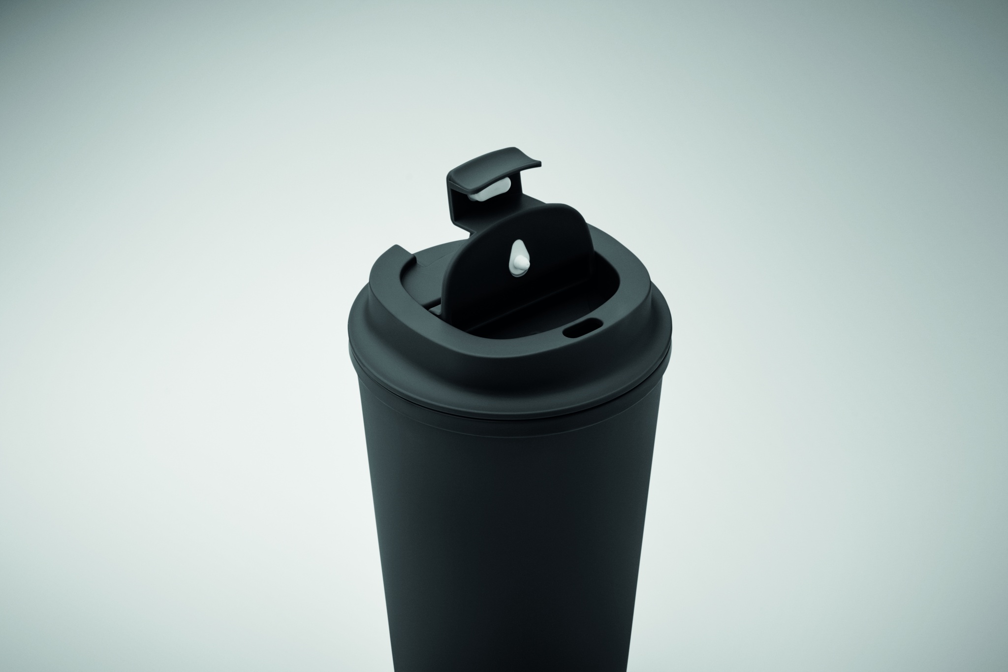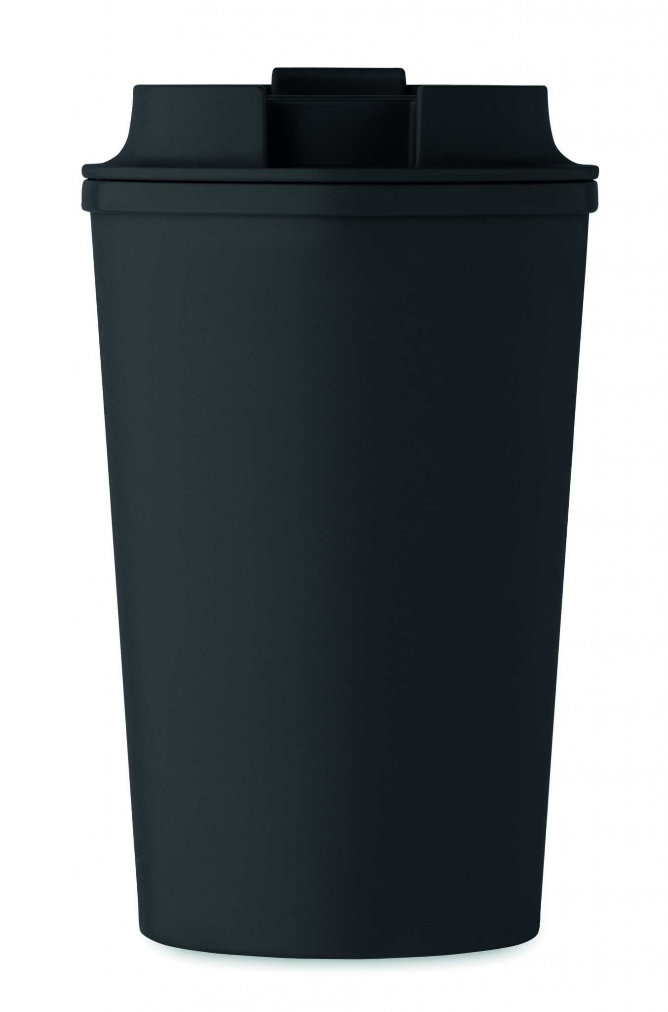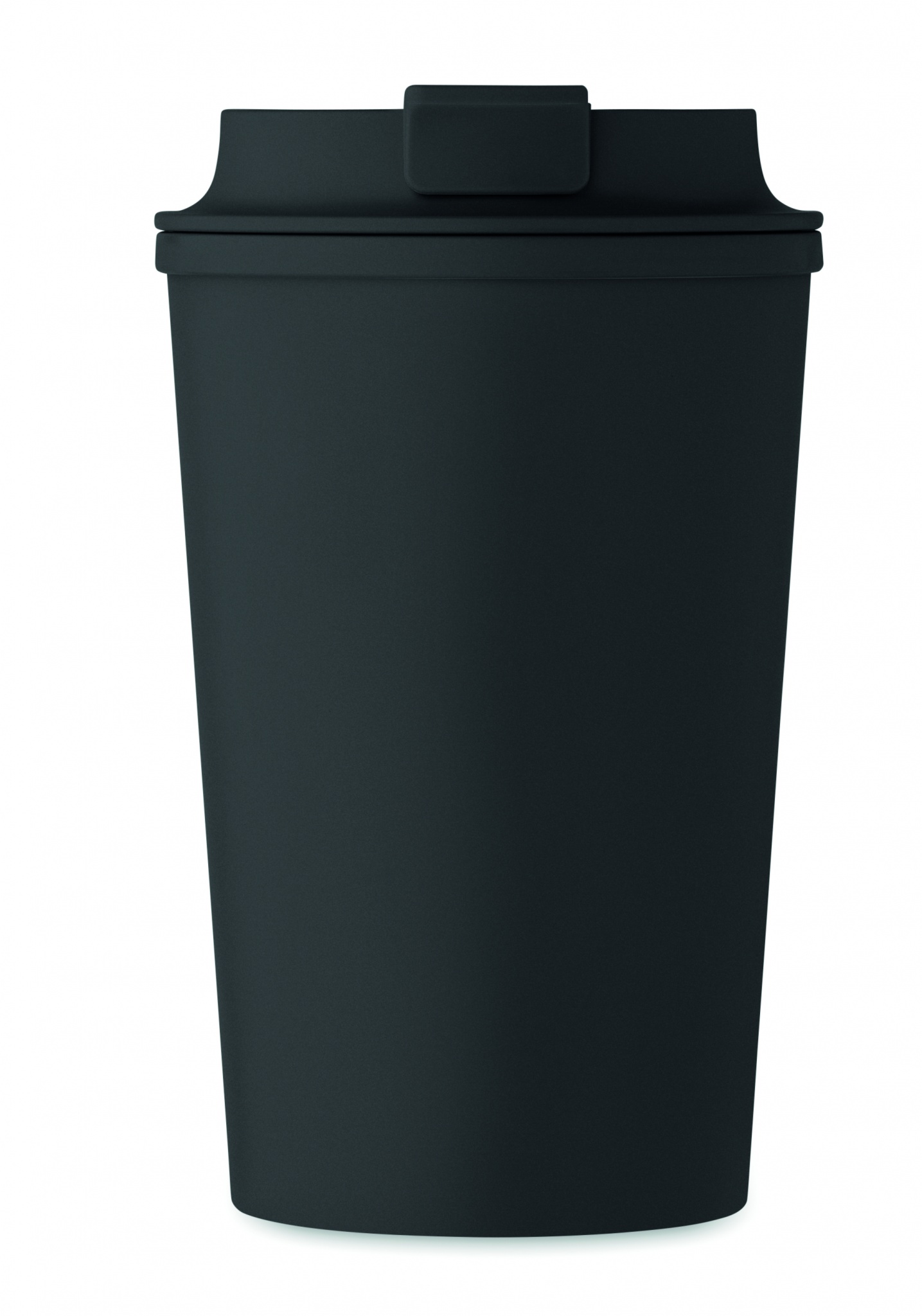 Doppelwandiger Becher aus 100% PLA-Mais mit Trinkdeckel aus recyceltem PP. Innenauskleidung aus TPR. Füllmenge: 350 ml.