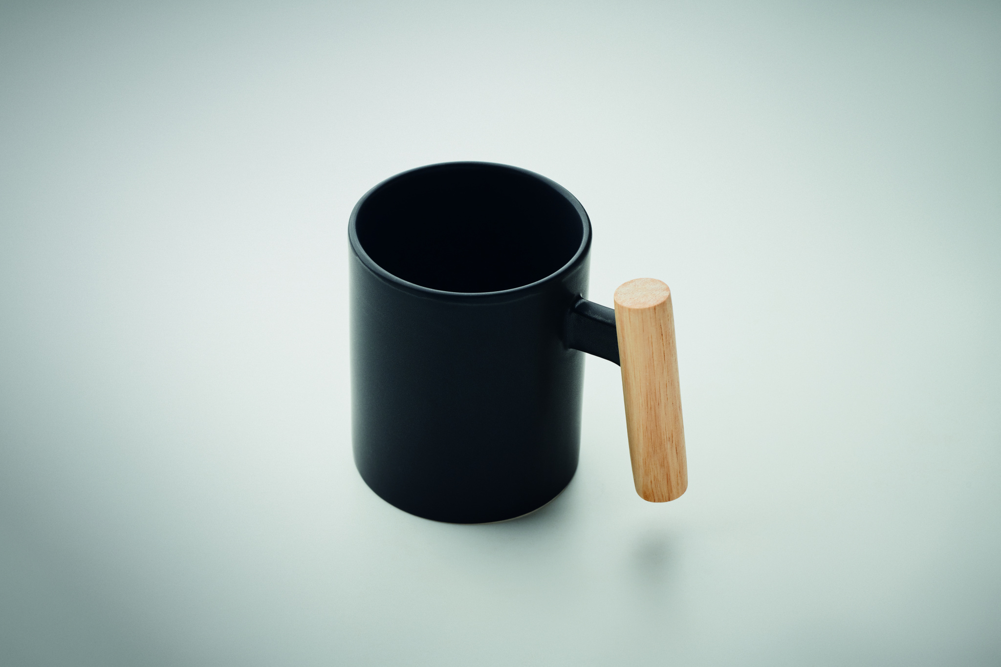 Becher aus Keramik mit Griff aus Holz. Füllmenge: 320 ml. Einzeln verpackt in weißer Schachtel.
