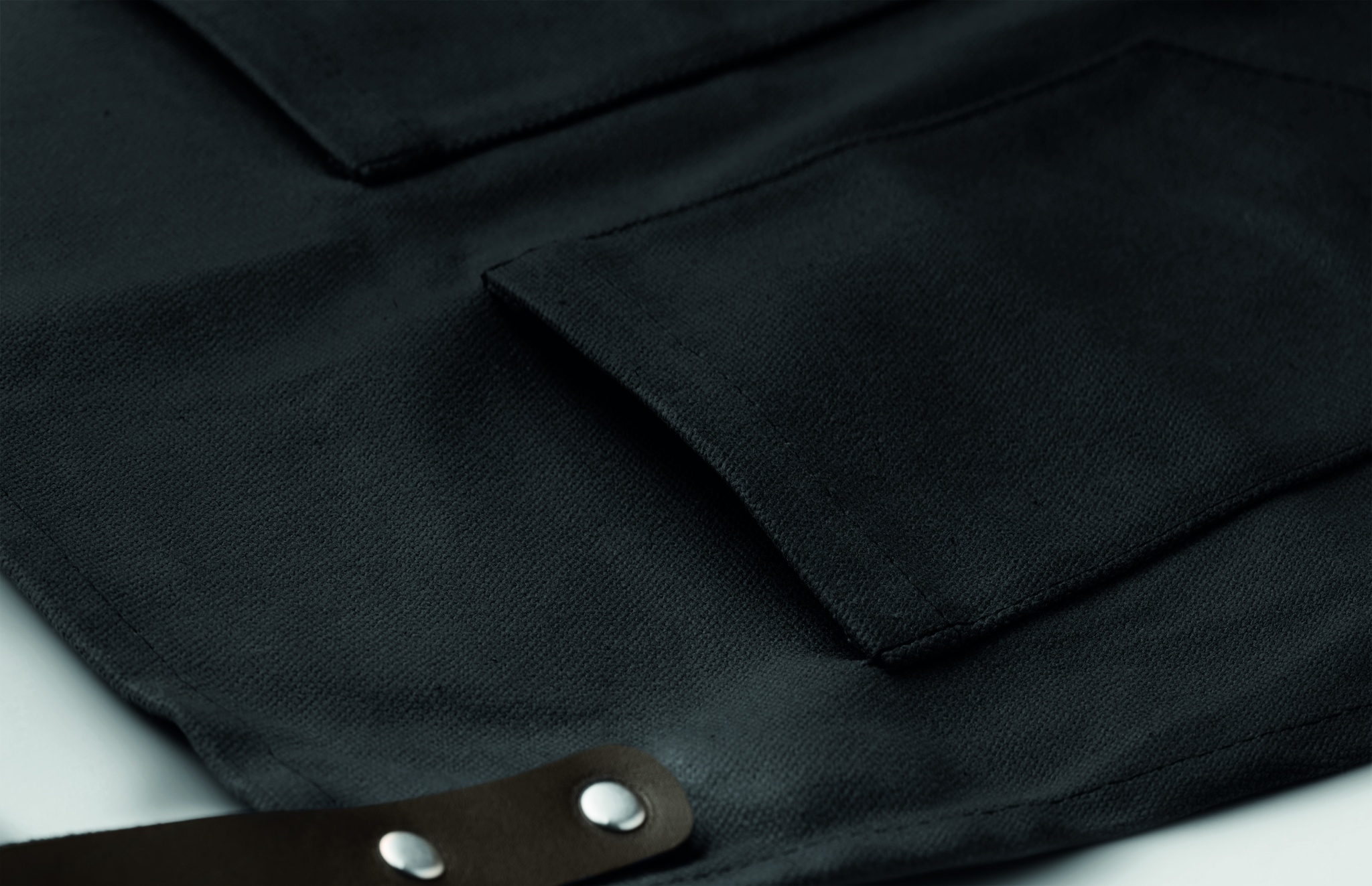 Schürze aus gewachstem Canvas. Verstellbarer Nackengurt sowie Bindegurt aus Leder. 2 Brusttaschen und eine große Fronttasche.