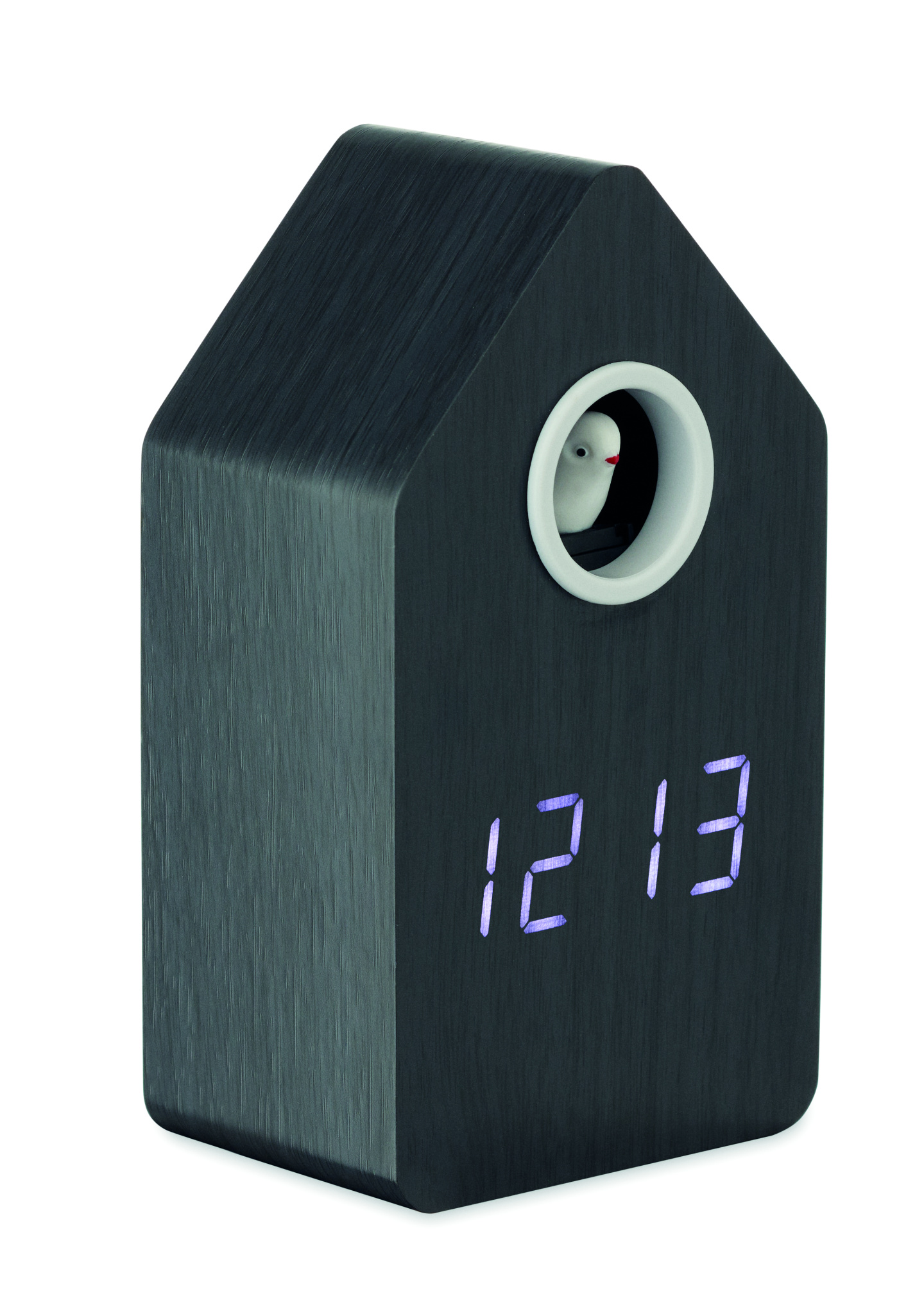 Kuckucksuhr aus MDF mit Kuckuck, Weckfunktion und Temperaturanzeige. Der Kuckucksruf ertönt zur vollen Stunde sowie als Weckruf. Automatische Nachtabschaltung des Stundentons zwischen 22:00 und 06:00 Uhr. Snooze-Funktion. Weiße LED-Anzeige.