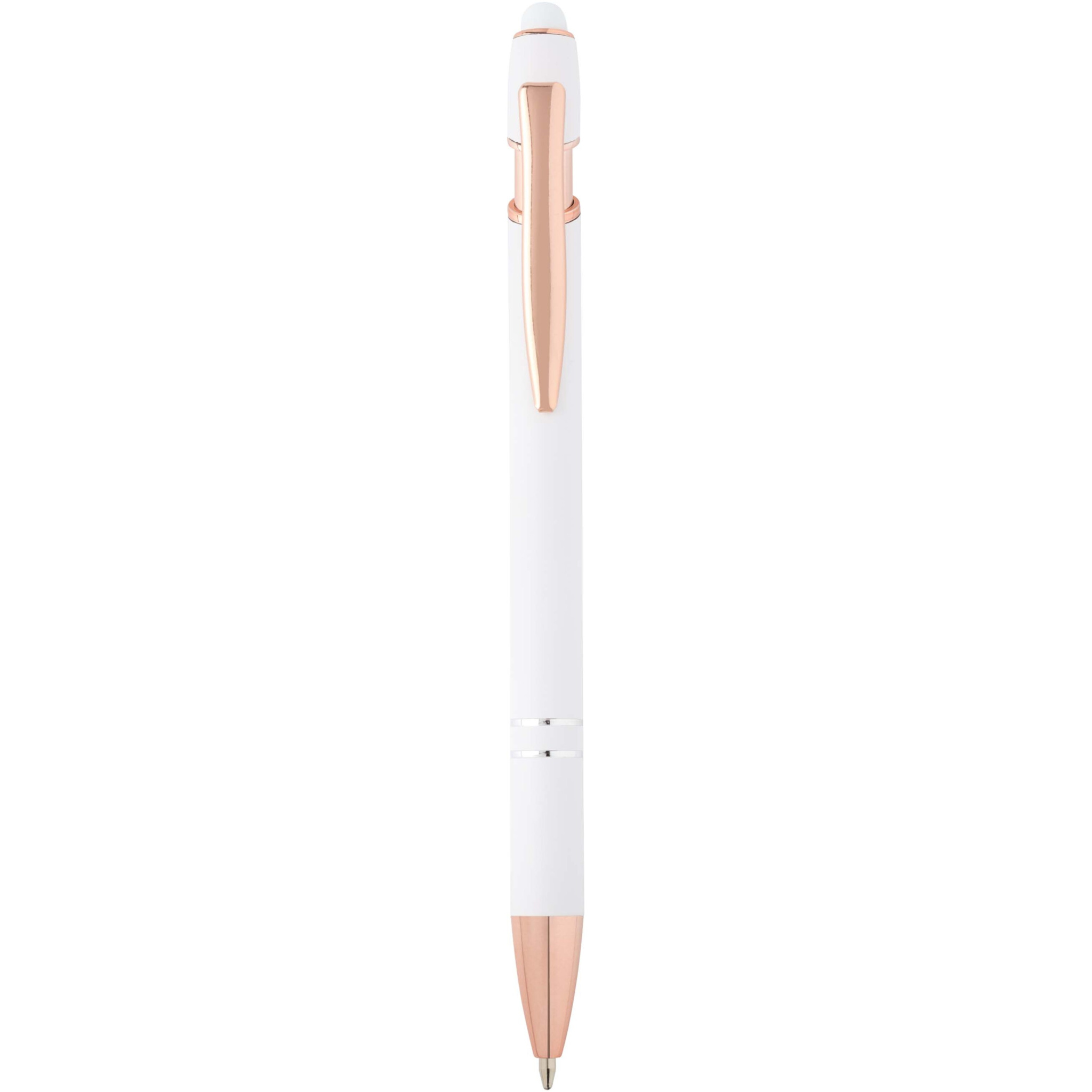 Der Nanna Kugelschreiber in Roségold hat einen Schaft aus recyceltem Aluminium und einen Stylus aus Silikon. Recyceltes Aluminium reduziert die Menge an Deponiemüll, schont die natürlichen Ressourcen und reduziert die Treibhausgasemissionen. Tintenfarbe: Blau. Schreiblänge: 800 Meter. Schreibspitze: 1 mm.