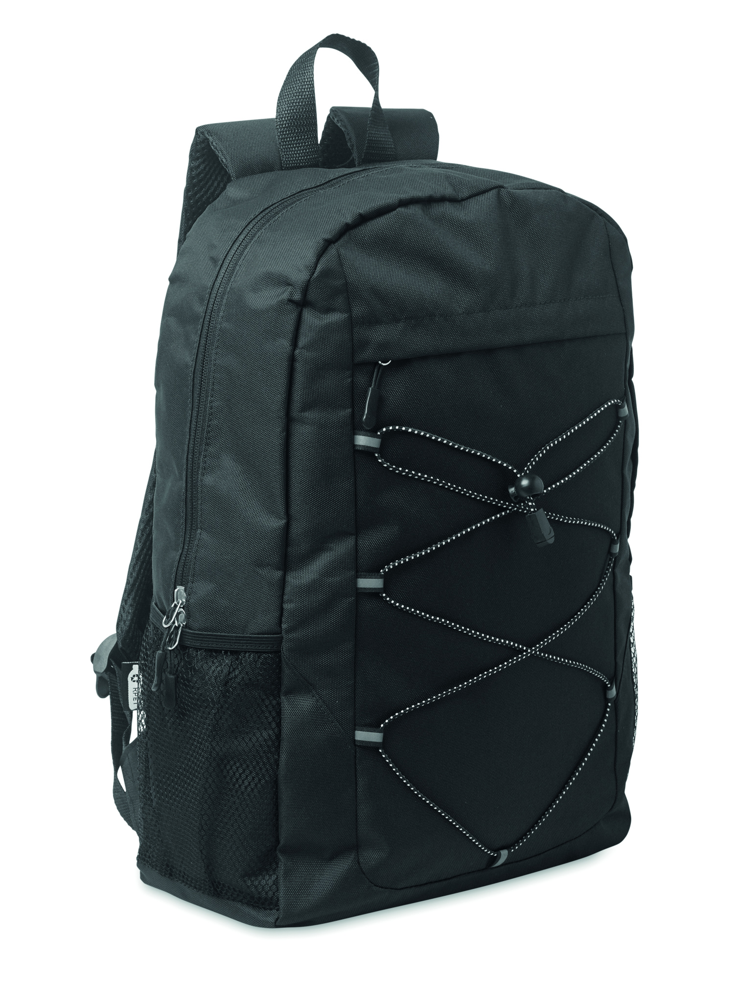 Rucksack mit Schnürung. Fronttasche mit Reißverschluss. Netztaschen auf beiden Seiten. 600D RPET-Polyester.