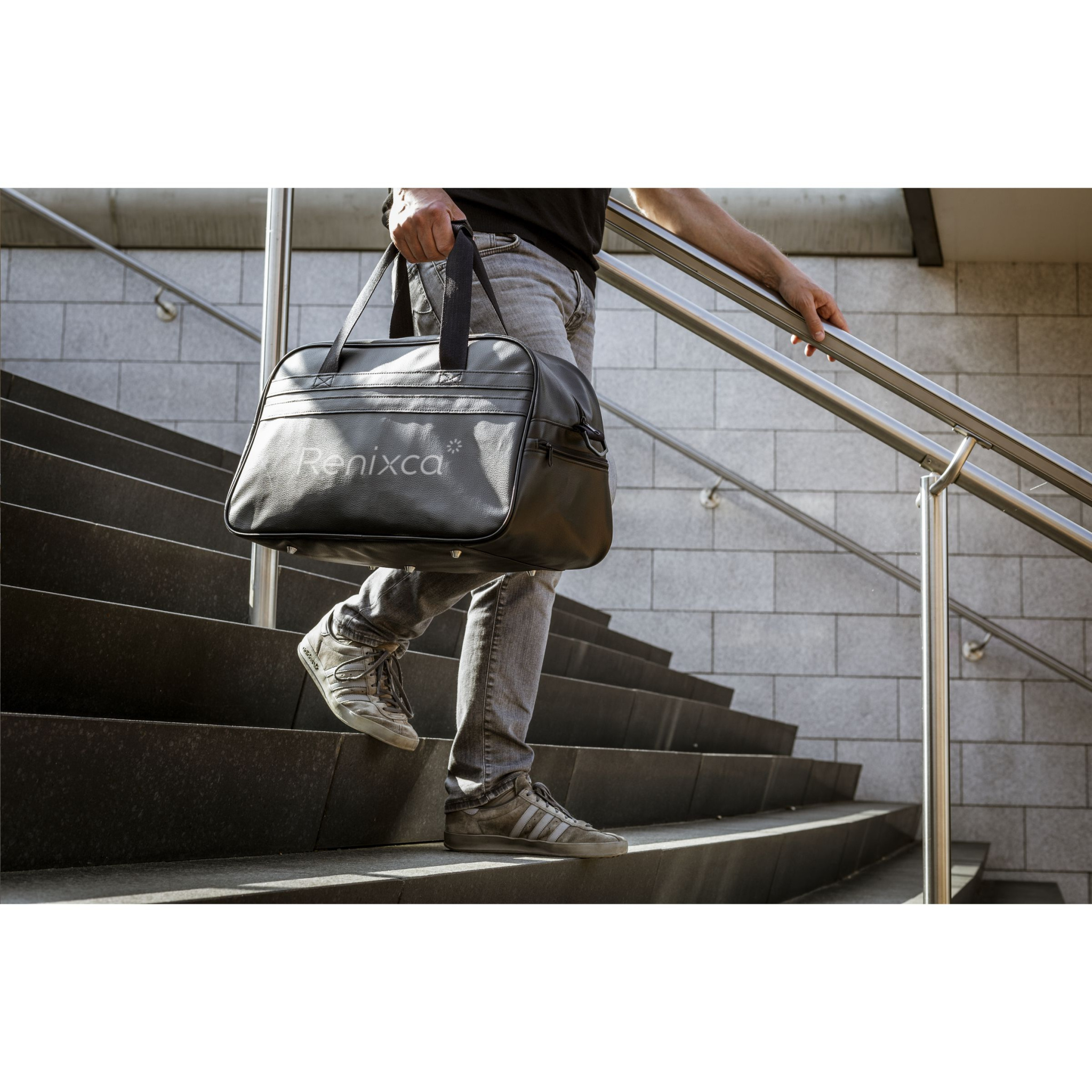 Praktische Wochenendtasche aus PVC/PU-Kunstleder mit attraktivem Design. Ein geräumiges Hauptfach und Reißverschlussfächer bieten viel Platz zum Verstauen Ihrer Reiseutensilien. Darüber hinaus ist die Tasche mit einem Innenfutter sauber verarbeitet und mit zwei stabilen Tragegriffen, einem Einsteckboden, Schutznieten und einem abnehmbaren, verstellbaren Schultergurt ausgestattet. Diese Wochenendtasche hat ein attraktives mattschwarzes Finish und ist aus hochwertigen Materialien gefertigt, die eine lange Lebensdauer dieses Produkts garantieren. Fassungsvermögen ca. 21,5 Liter.
