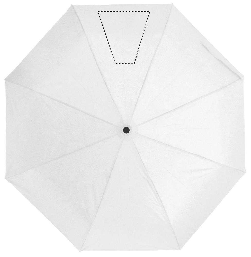 Foldable 21 inch umbrella, 3 sections with 190T RPET pongee fabric, black plated frame and ribs with wooden handle. Manual open and closure. Self material pouch.