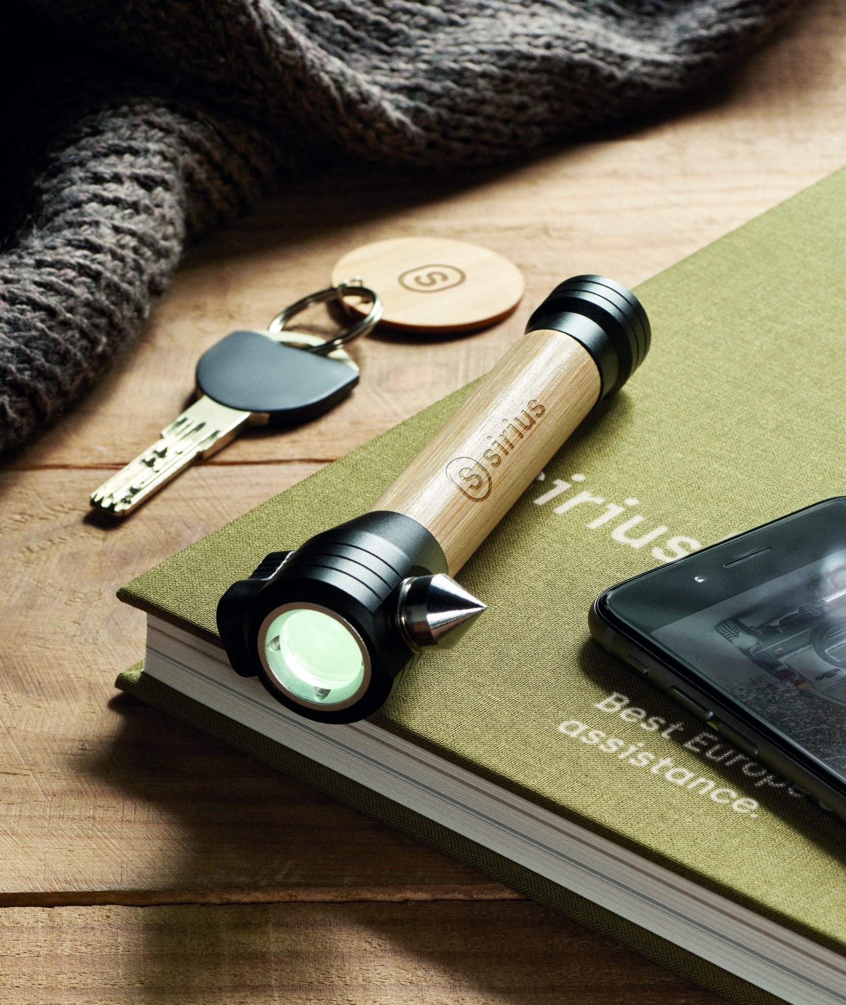 Products Tools 3-in-1 bamboo flashlight with an emergency hammer and seatbelt cutter