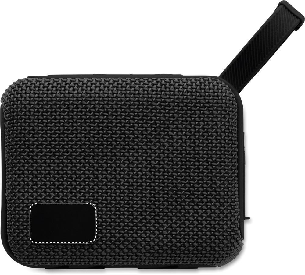 5.0 wireless speaker in ABS with RPET fabric and hanging cord. 1 Rechargeable Li-ION 800 mAh battery included. Includes an SD card port and an AUX/ USB cable. Output data: 5W, 3 Ohm and 5V. Playing time approx. 3h