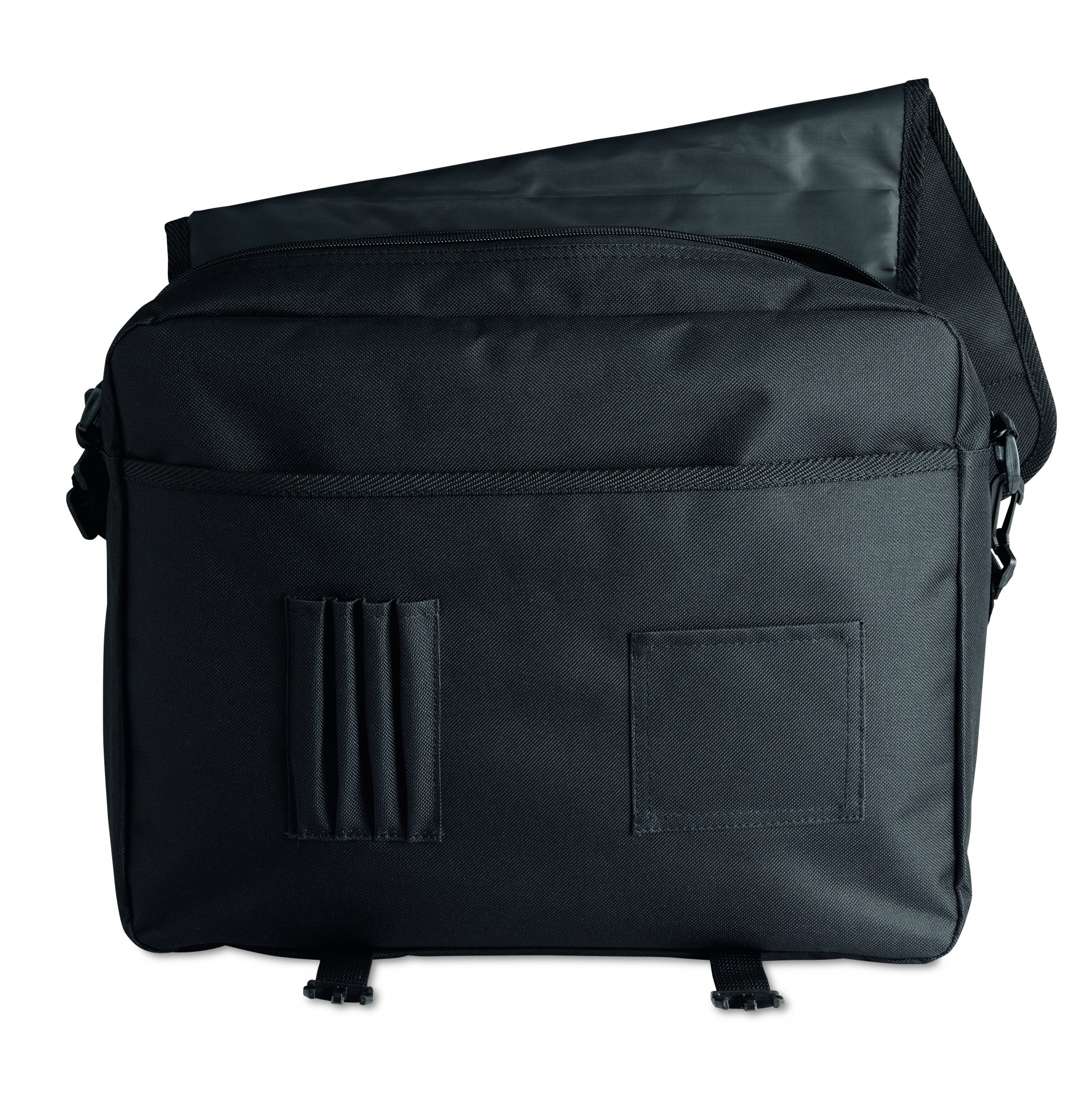Document flap bag in 600D polyester with zipped main compartment and several pockets with an adjustable and detachable shoulder strap.