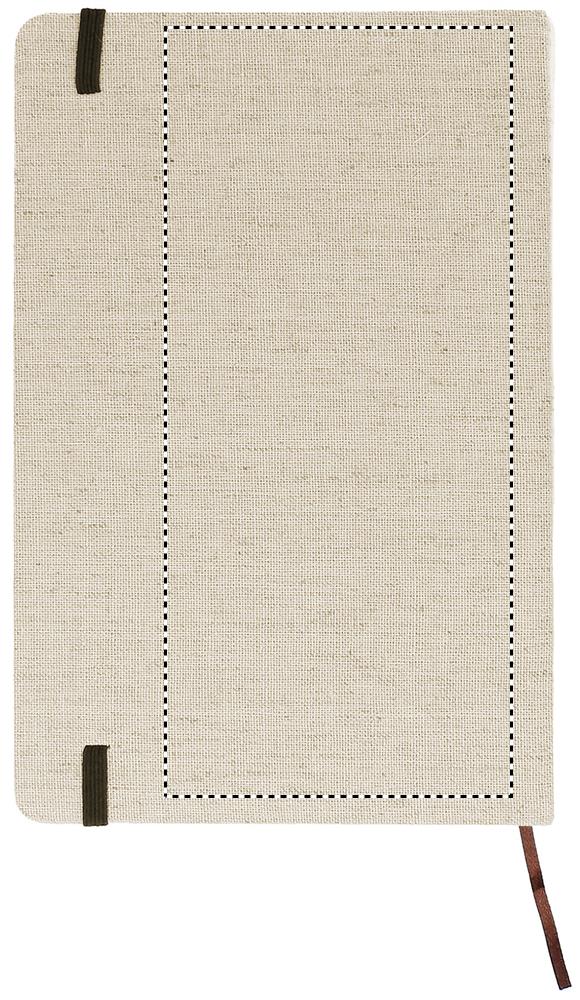 A5 notebook with hard canvas cover. Casebound. 192 lined pages (96 sheets). Contrasting elastic closure strap and ribbon page-marker.