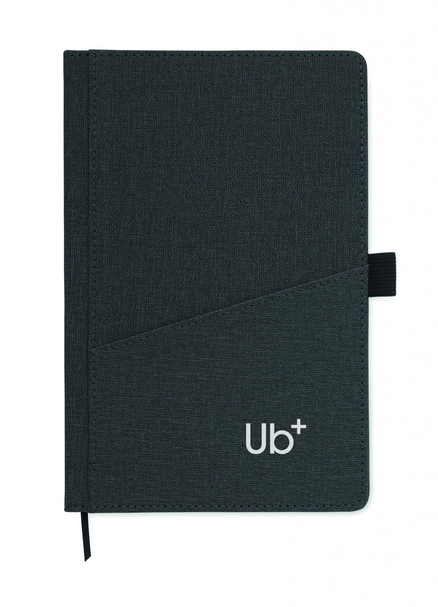 A5 notebook with PU hard cover with front phone pocket. Case bound. 160 recycled paper lined pages (80 sheets). Matching ribbon bookmark.
