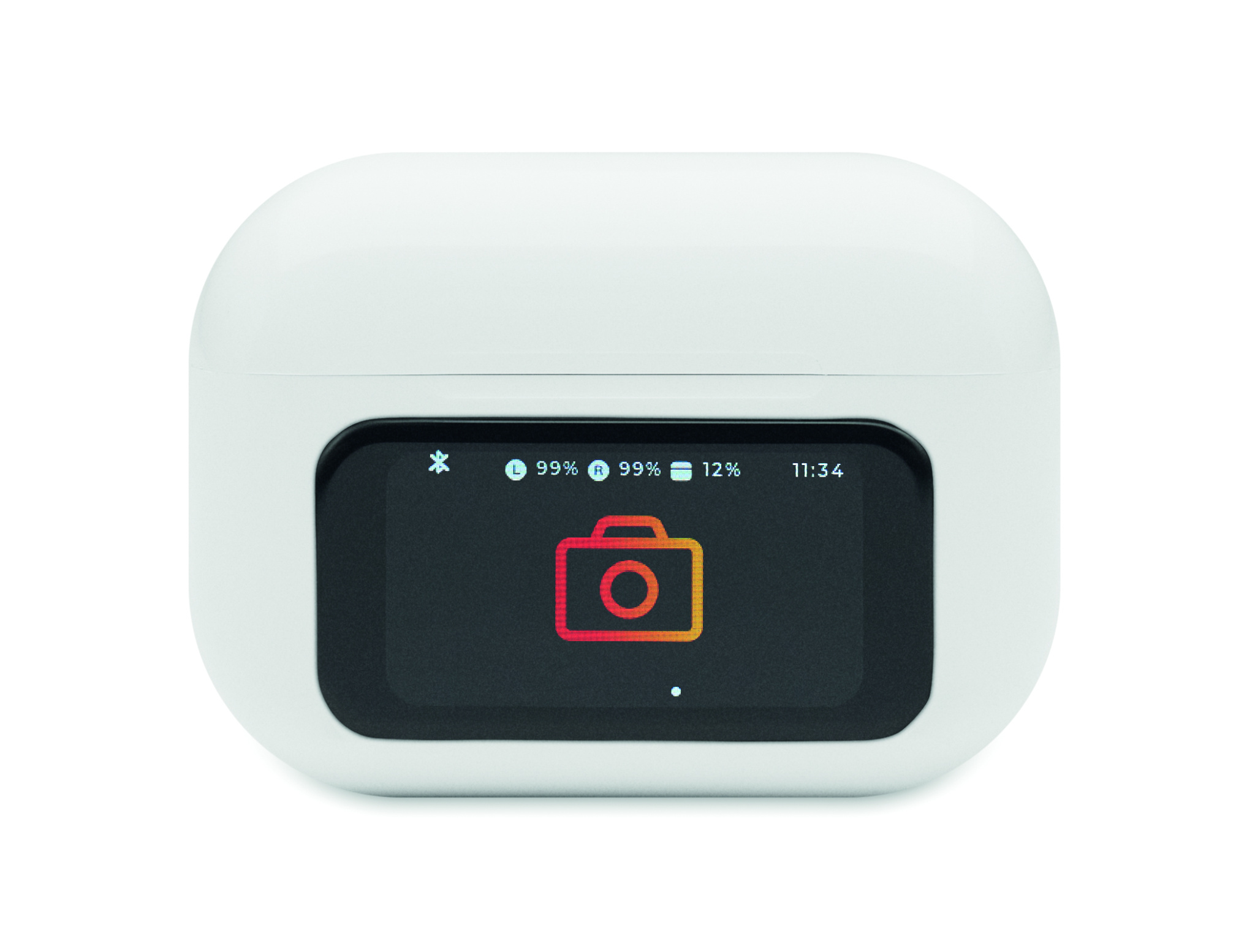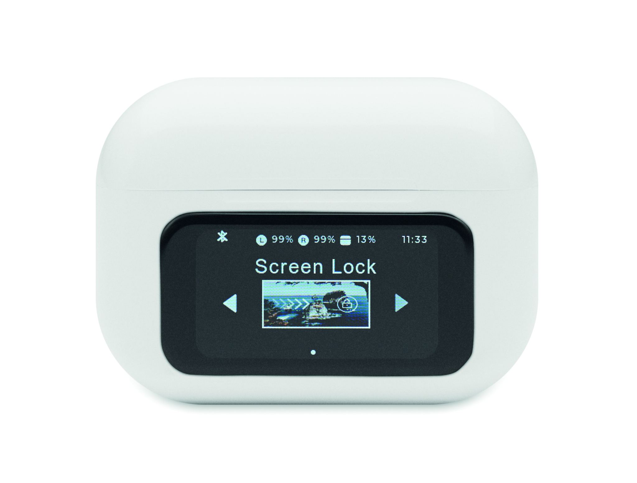 ABS True Wireless Stereo (TWS) 5.0 wireless stereo earbuds (30 mAh) with ANC/ENC and microphone and 230 mAh charging base. Touch screen control and display.