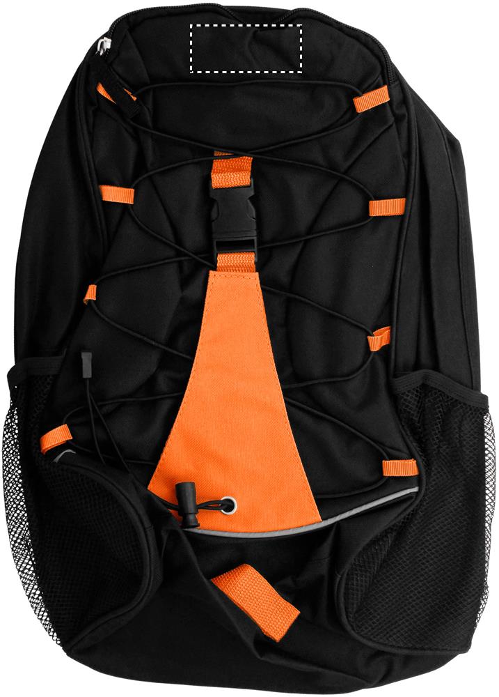 Backpack in 600D polyester with colourful contrasting facing and decorating cord on the front panel. Mesh pockets on both sides.