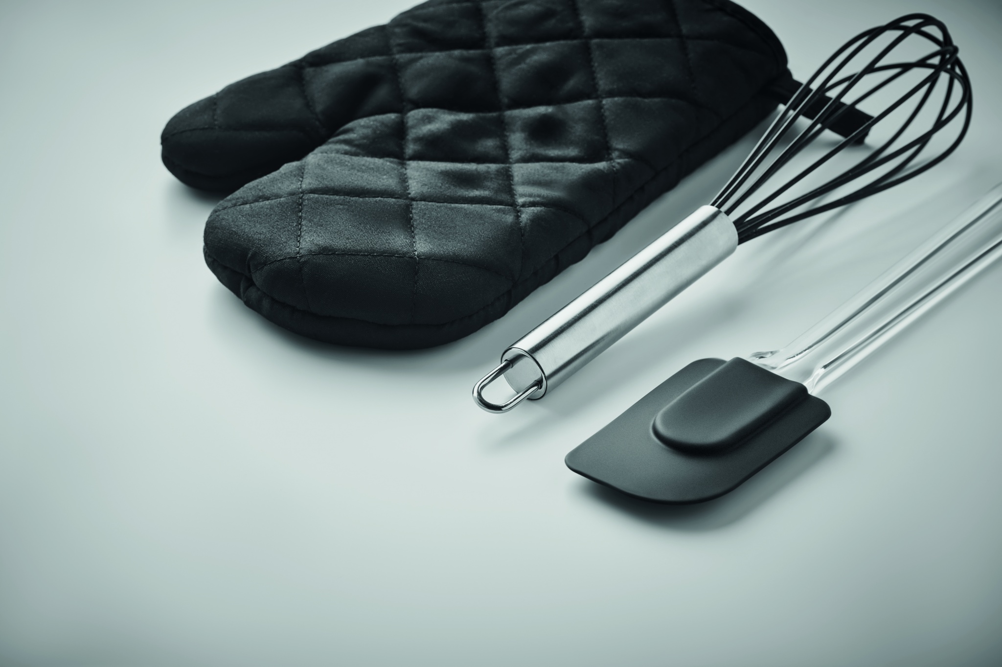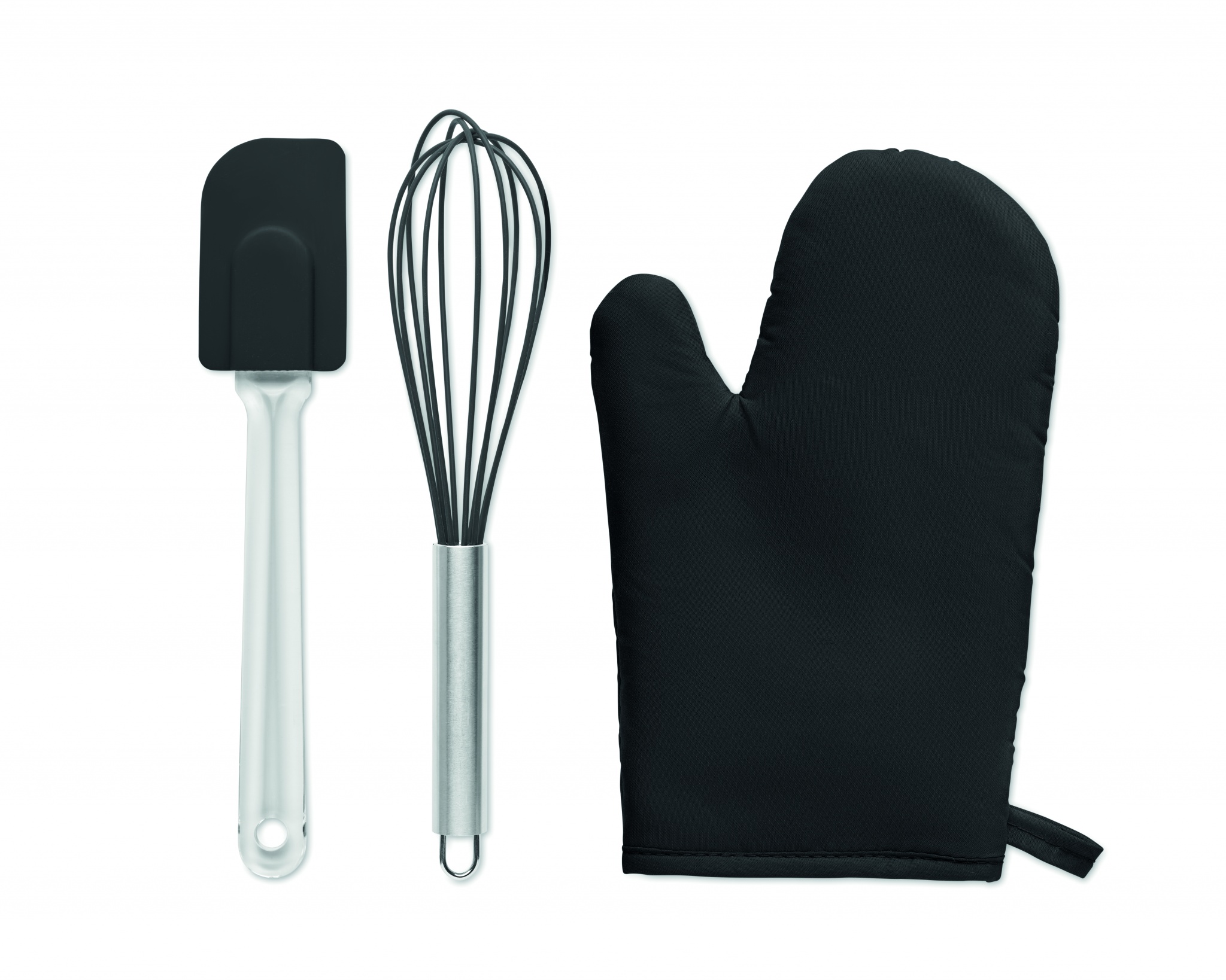 Baking utensils set. Including a polycotton (95% polyester and 5 % cotton) oven glove, whisk and spatula in silicone.