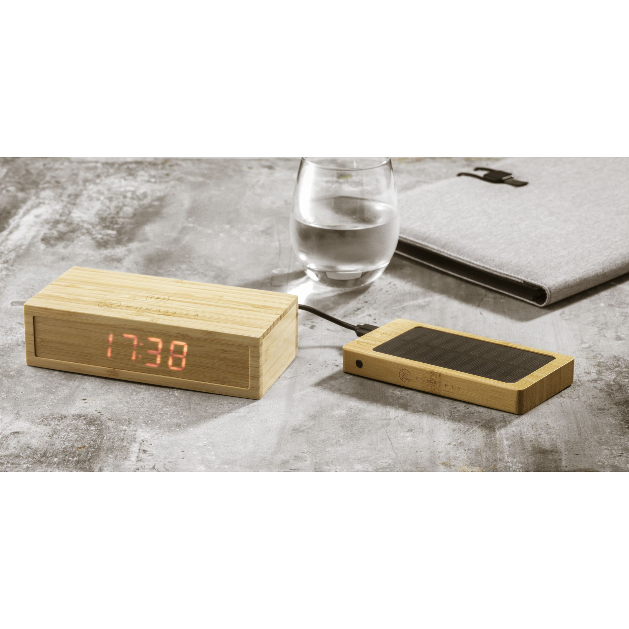 10W wireless charger and alarm clock with digital 24-hour display with casing made entirely from bamboo. As well as the ability to charge wirelessly, this product also features a USB port for charging devices via a cable. Compatible with all QI devices such as the latest generation of Android, iPhone 8 and above. Input 9V/2A: Wireless output 5V/2A-10W: 1 USB output 5V/2A. Includes a PVC-free cable (TPE) with USB-C connector, a user manual and batteries. Each item is supplied in an individual brown cardboard box.