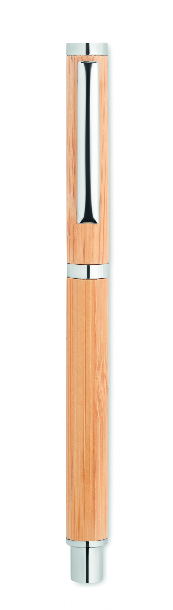 Bamboo barrel roller ball pen with stainless steel fittings. Blue gel ink. Bamboo is a natural product, there may be slight variations in colour and size per item, which can affect the final decoration outcome.