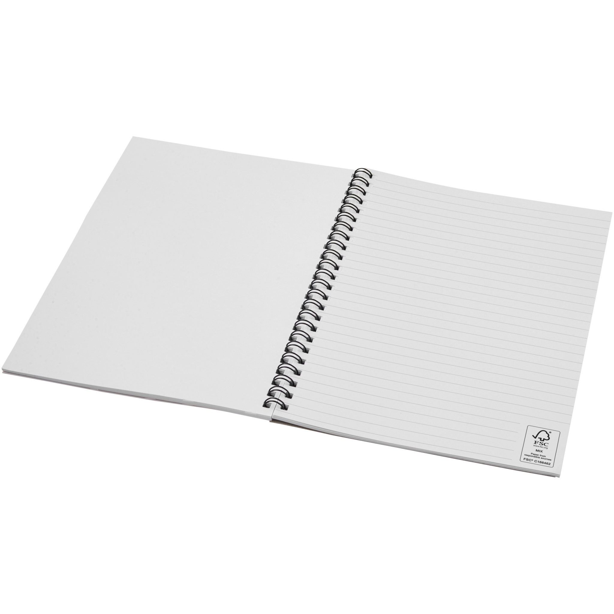 Add some bold colour to your notes with this A5 spiral notebook. It includes 50 sheets of blank 80 g/m2 recycled paper and a 300 g/m2 card front cover in a choice of colours. You can customise the pages of this versatile notebook with any design - so whether you want lined paper, squares or dots - anything is possible! Manufactured using responsibly sourced materials. Made in the UK.