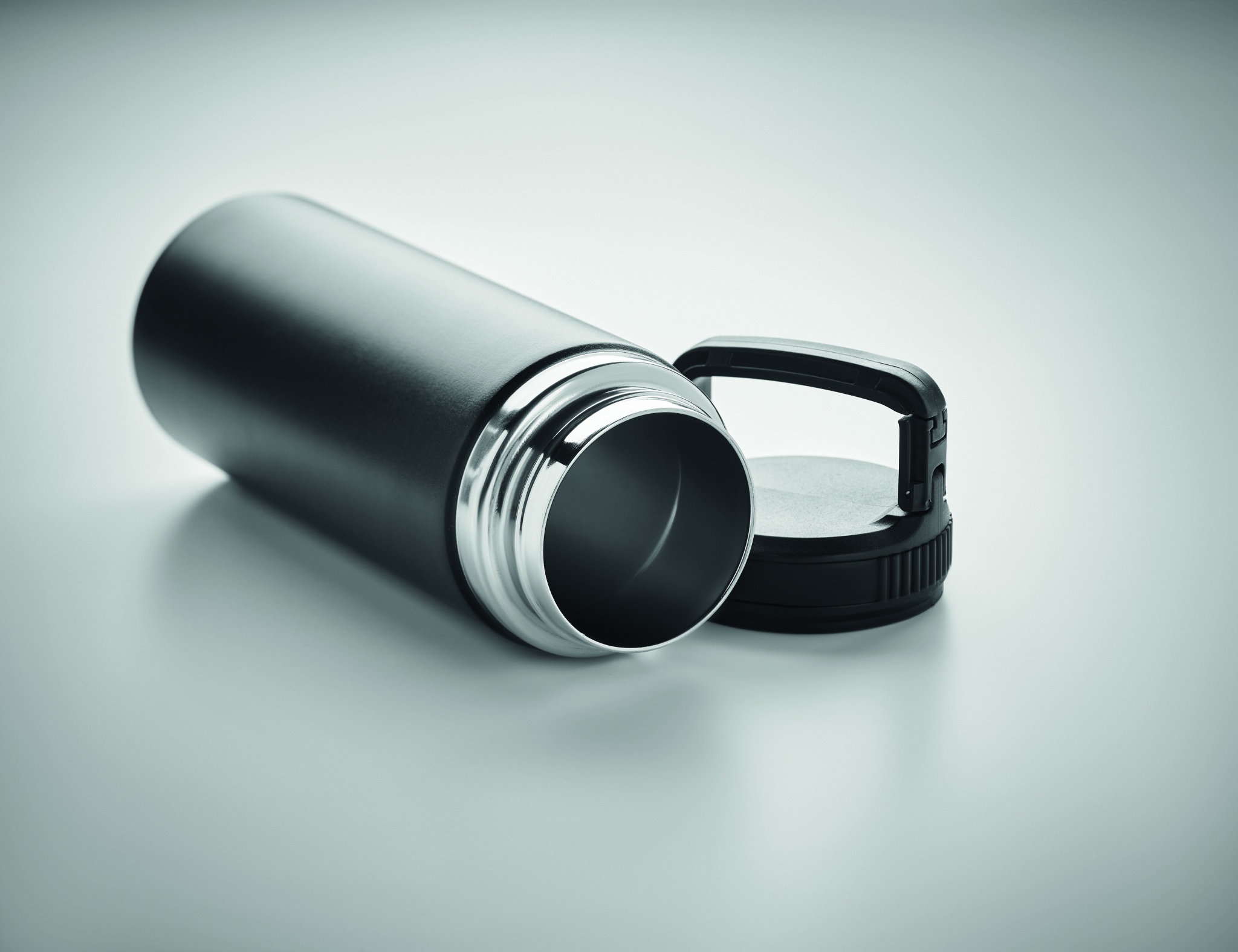 Double wall stainless steel vacuum insulated bottle with hook hanger on lid. Capacity : 500 ml.