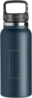 Double wall stainless steel vacuum insulated bottle with hook hanger on lid. Capacity: 970 ml.