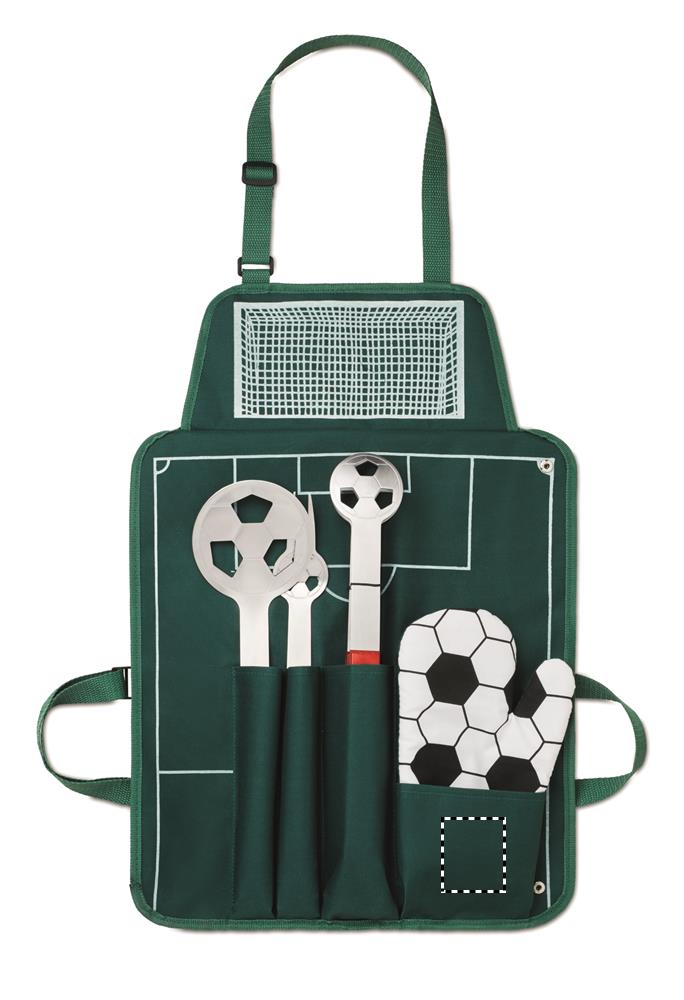 Barbecue apron with three different tools and one glove. Apron in 600D polyester.