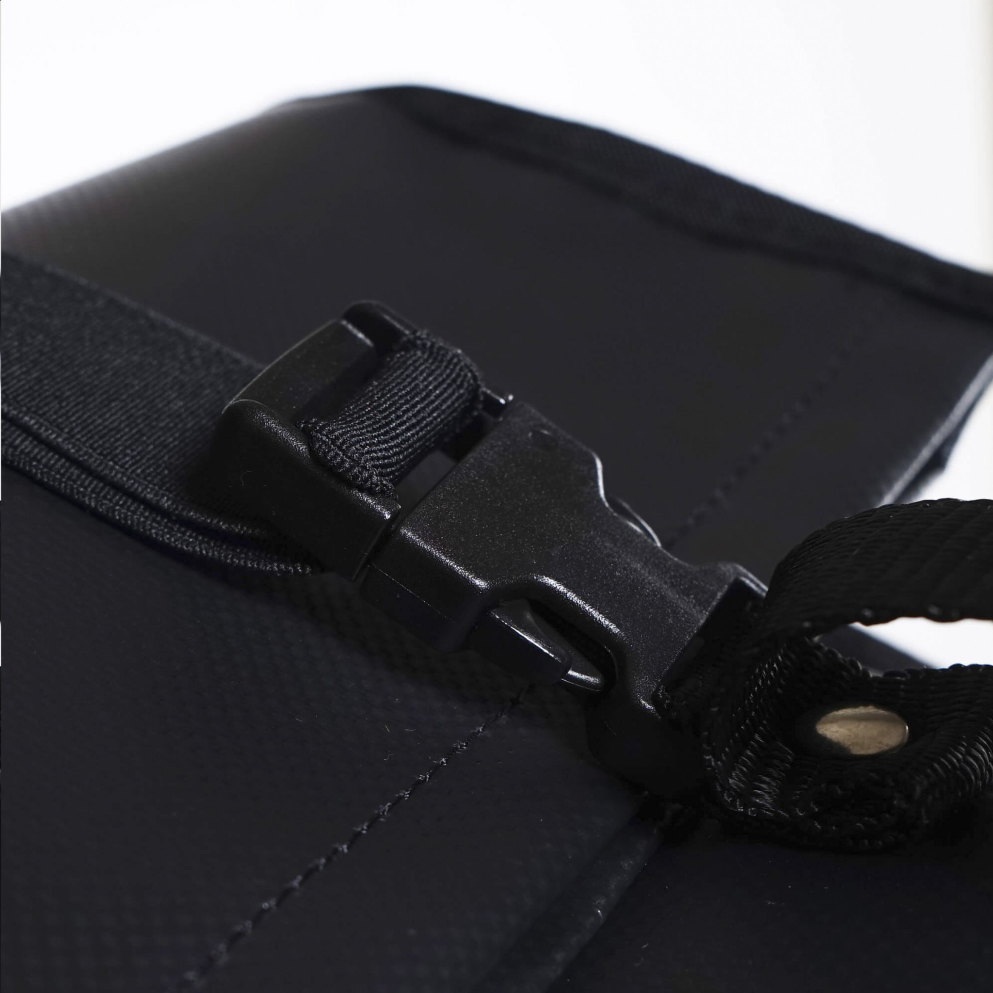 Bicycle bag from the Fraenck brand, made from upcycled sailcloth. The sturdy and water-repellent material comes from upcycled leftover materials from the sail-making industry. The roll top closure can be rolled up and secured with closure clips. Both sides of the bag are reinforced with bias tape. The inside has a reinforced bottom and back. Easy to attach to the bicycle rack. Made in Holland.