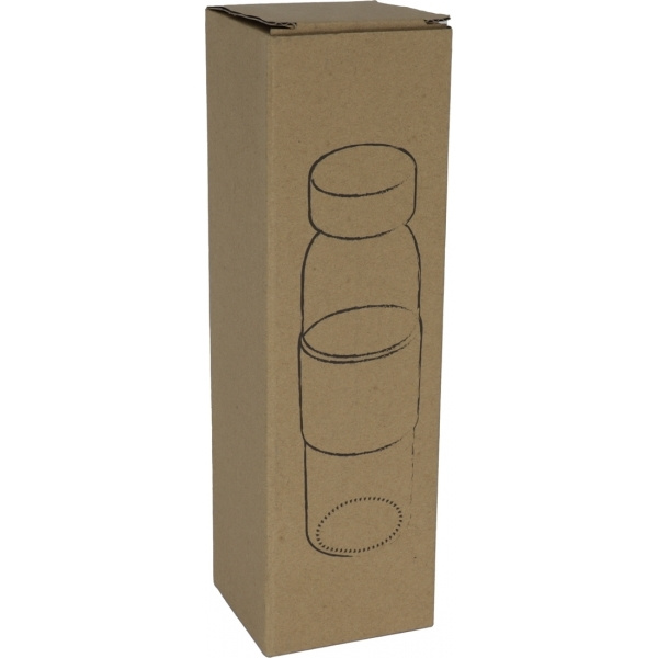 Glass bottle with a capacity of 500ml, a cork sleeve for a particularly pleasant hand feeling and a bamboo lid. We laser your logo onto the cork coating.