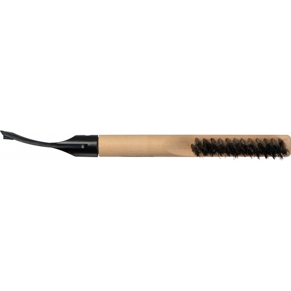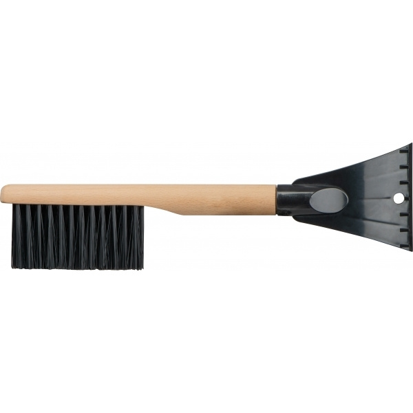 2-in-1 ice scraper with snow brush. It features a wooden handle for a comfortable grip even in cold temperatures, and a hanging loop on the ice scraper.
