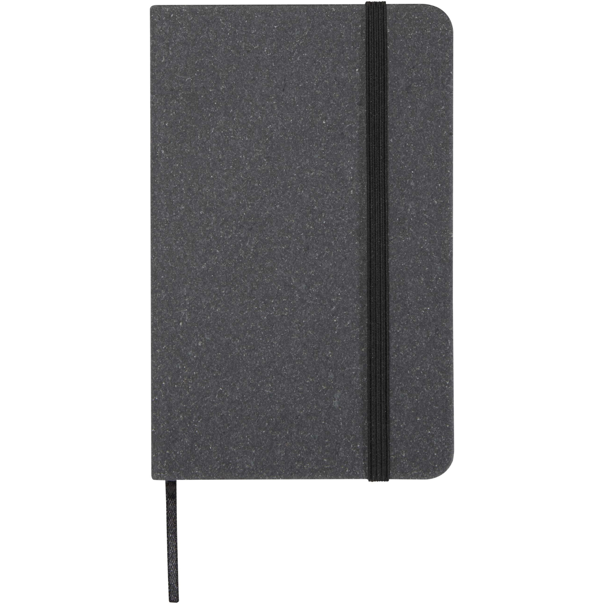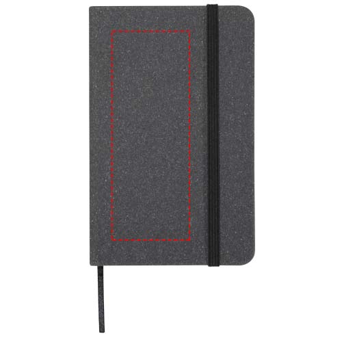 A practical gift set featuring an A6 notebook and MagSafe wallet. The notebook has a dark grey recycled plastic cover, 80 lined cream-coloured sheets of 70 g/m² paper, and a black elastic closure. The transparent MagSafe wallet holds one card and attaches magnetically to iPhone 12 or newer models, and also comes with an extra metal ring for use with other phones. Both items are presented in a sleek black cardboard gift box.