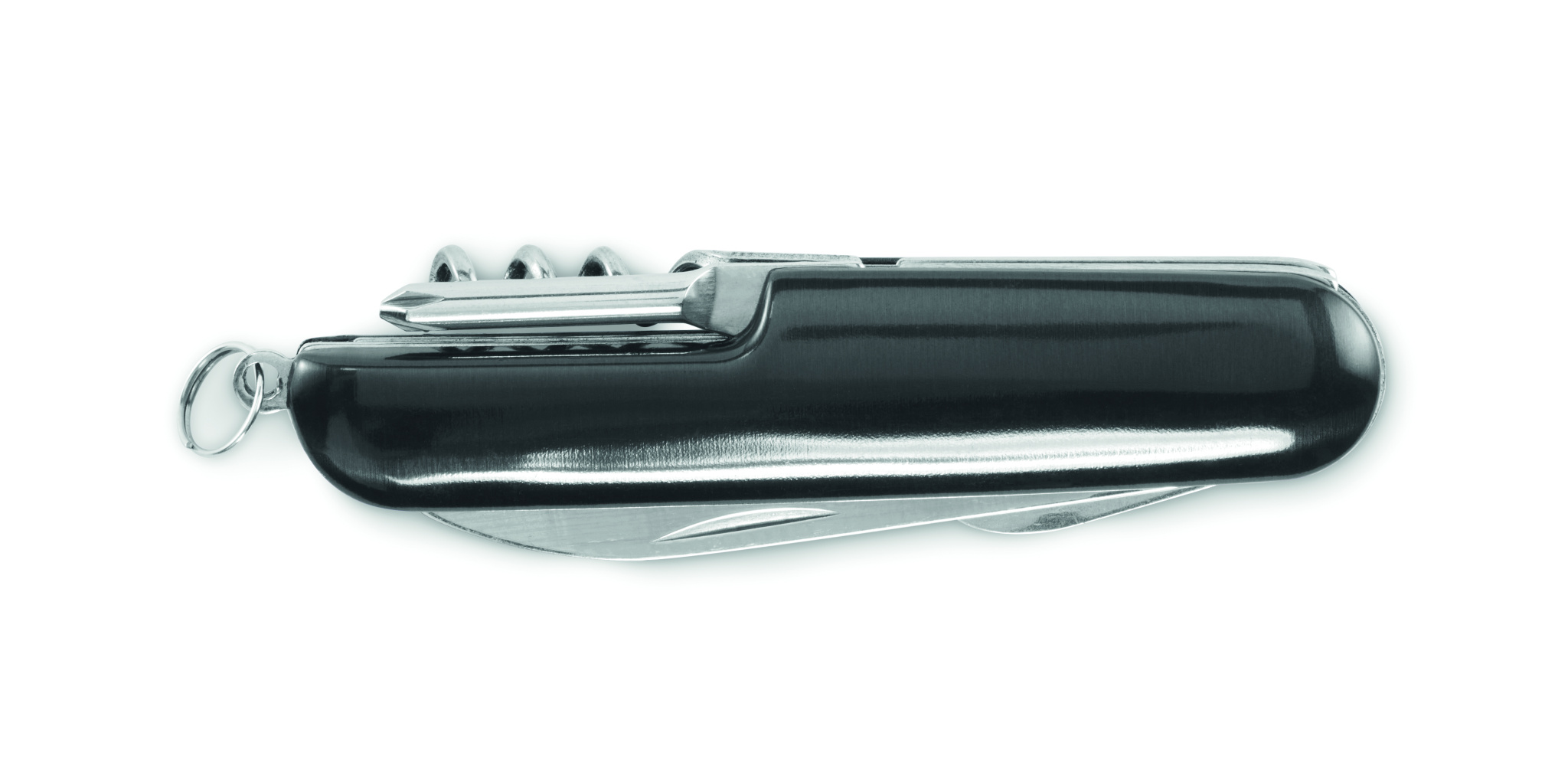 Recycled aluminium multi-function pocket knife. 5 functions: large blade, bottle opener, screwdriver, corkscrew and can opener