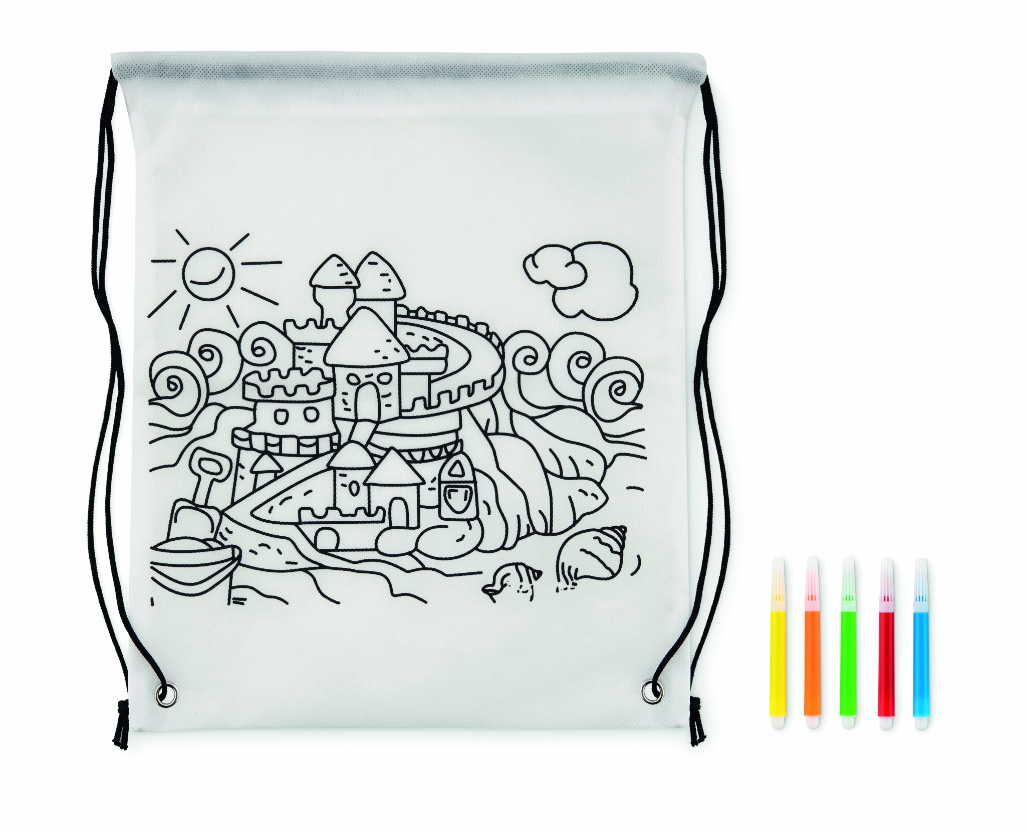 Non woven drawstring bag with 5 markers and design to colour in. 80 gr/m². Standard imprint.