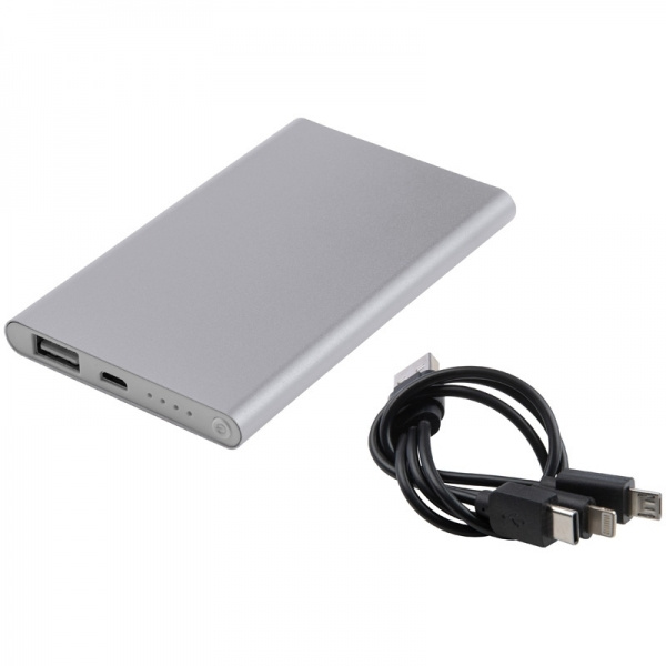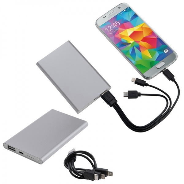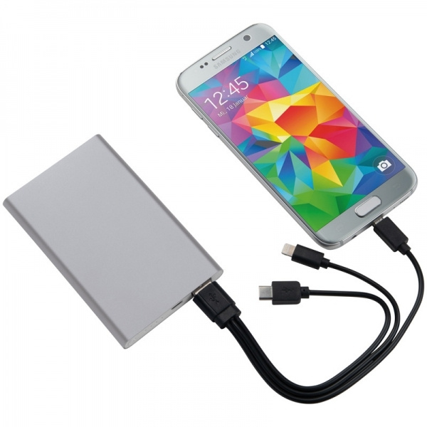 Aluminium power bank with 4.000 mAh charging capacity, charge indicator, multiplug charging cable (lightning, USB Type C, and Micro-USB.) Your logo will be engraved.