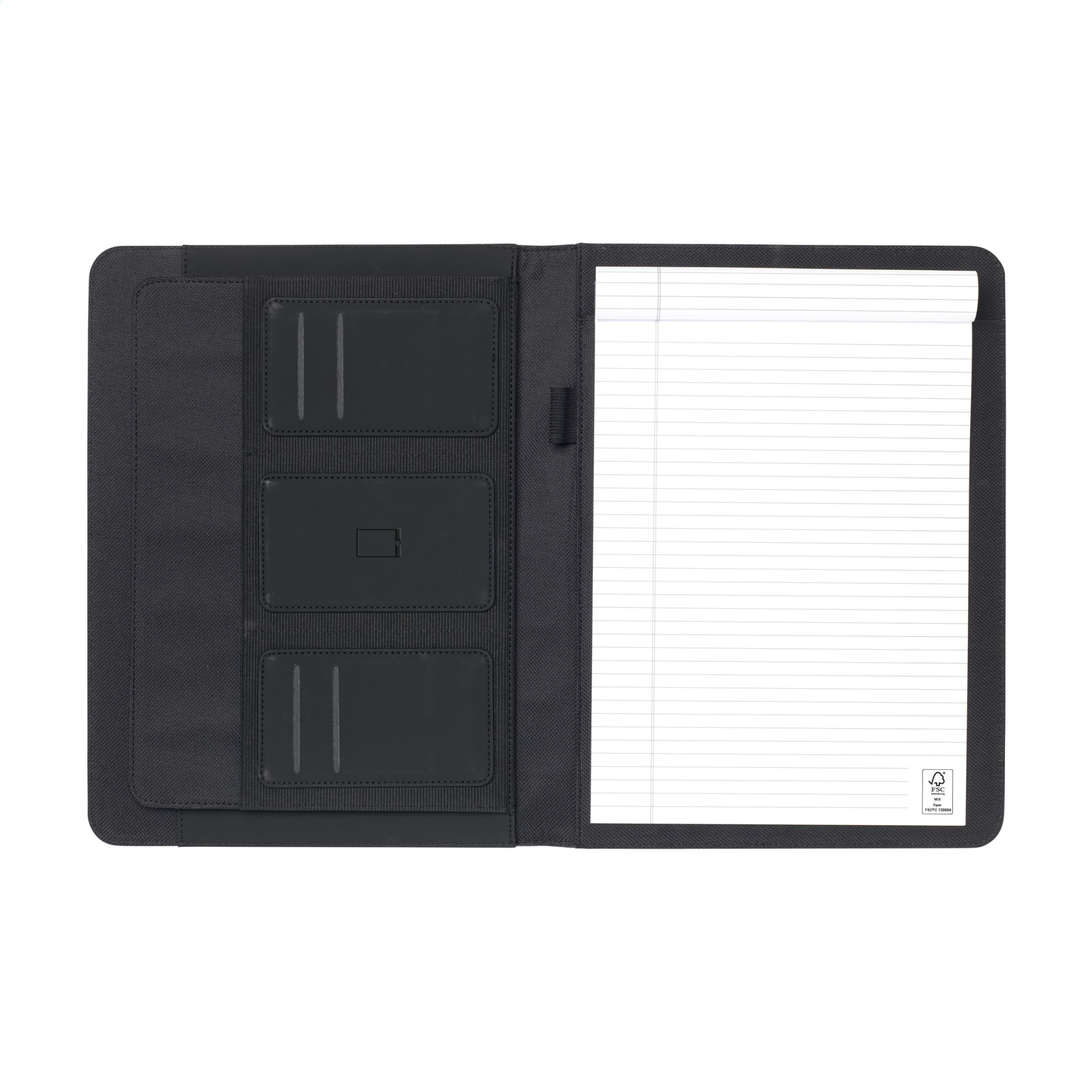 WoW! A modern A4 writing document folder with a sturdy padded cover made from RPET. The inside of the folder has a handy pen loop, and various insert pockets, including a separate compartment for storing a mobile phone and credit cards. Includes a notepad with 30 sheets of lined paper (70 g/m²). A sustainable and environmentally friendly product.