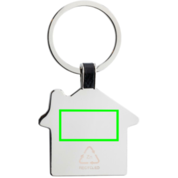 House shaped keychain made from RCS recycled zinc alloy. Total recycled content: 84% based on total item weight. RCS certification ensures a completely certified supply chain of the recycled materials. Packed in paper bag.