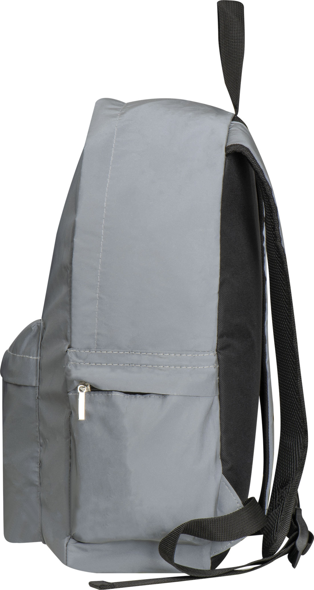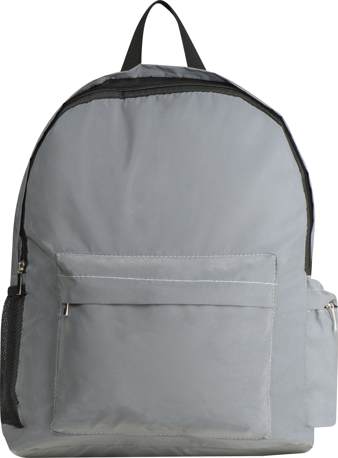 For increased visibility! Highly reflective backpack made of 190T and 600D polyester. It features a laptop compartment, a side mesh pocket, a side pocket with a zipper, padded adjustable shoulder straps, and a front pocket with a zipper.