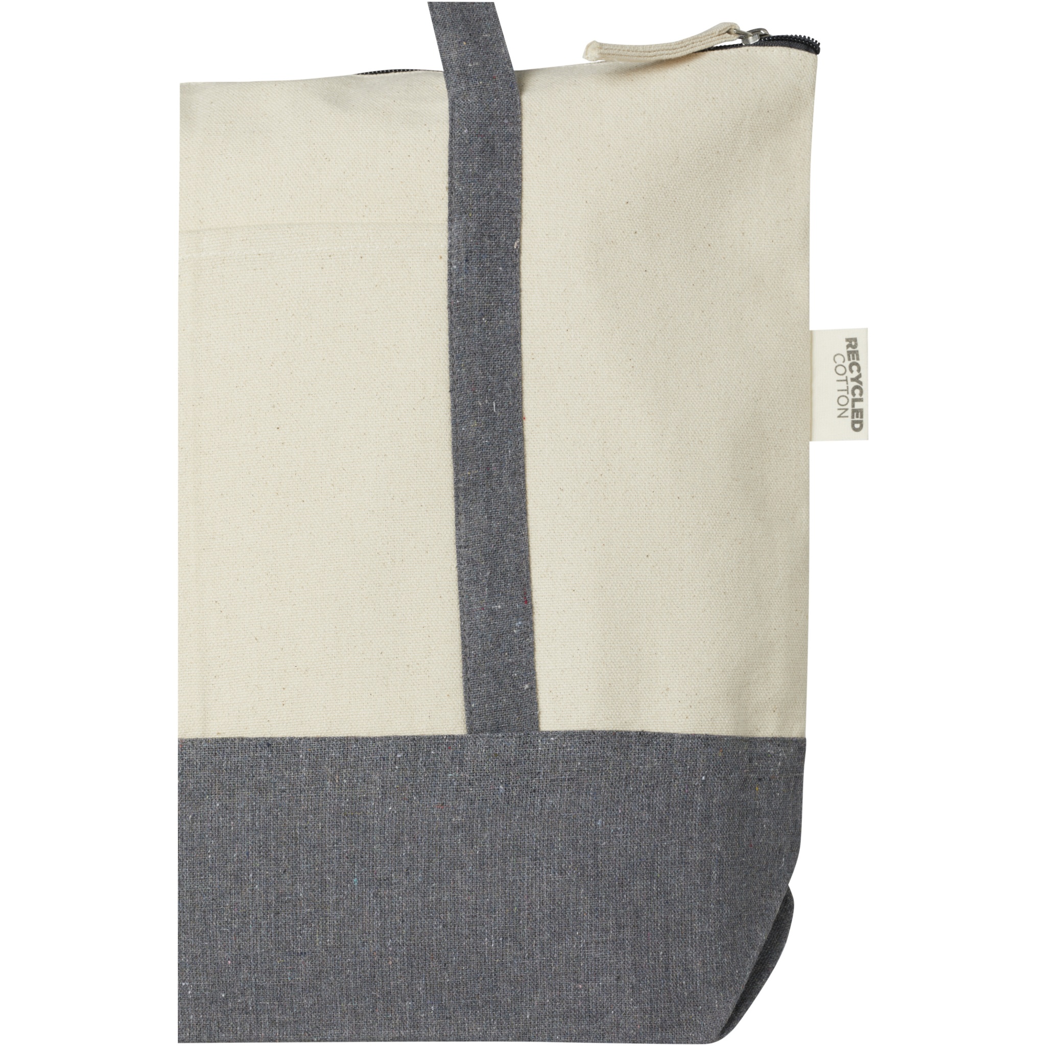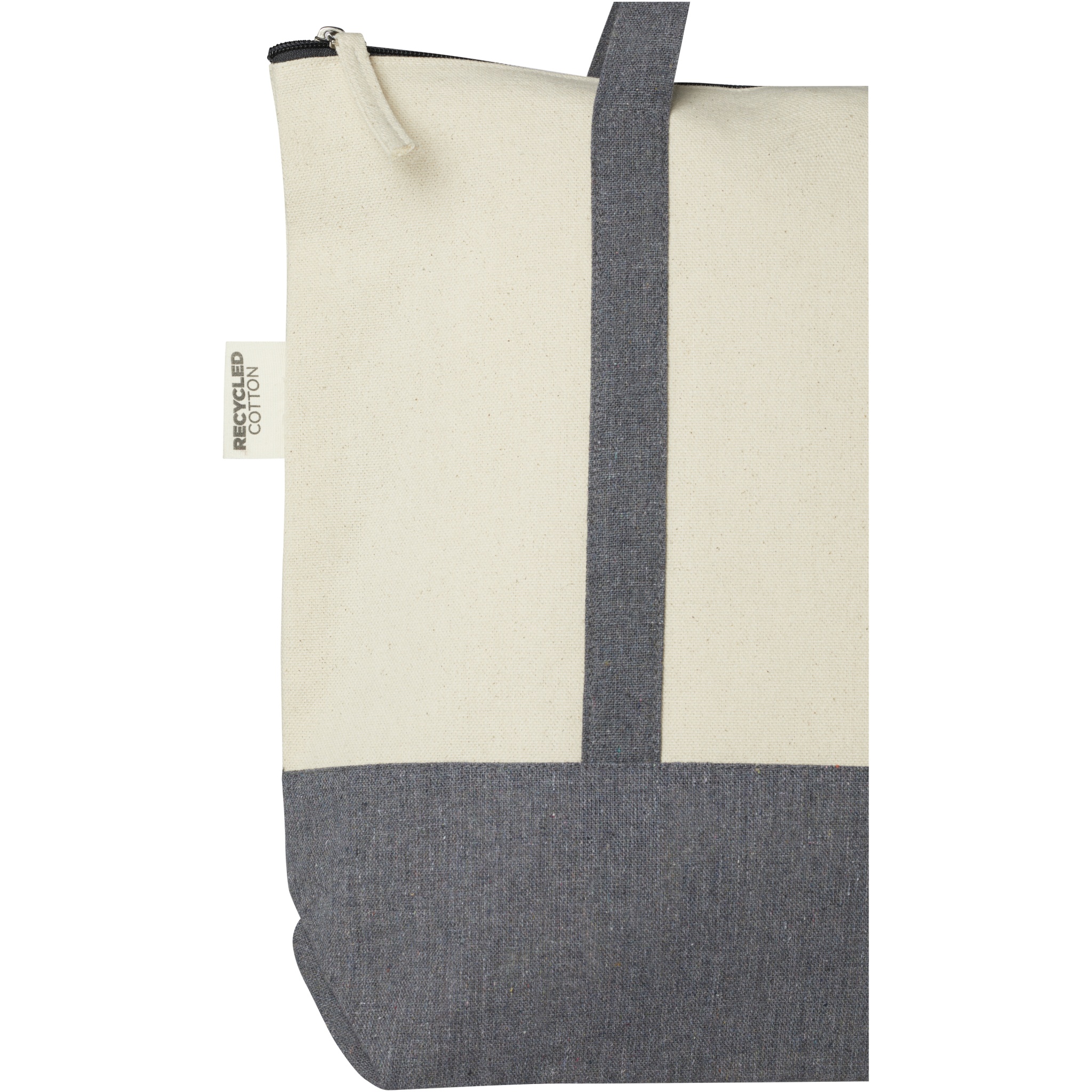 The Repose 320 g/m² recycled cotton zippered tote is made from eco-friendly, pre-consumer recycled cotton. Featuring a zippered main compartment, on-trend colour blocking, front slash pocket and 27 cm handles. Resistance up to 10 kg weight.