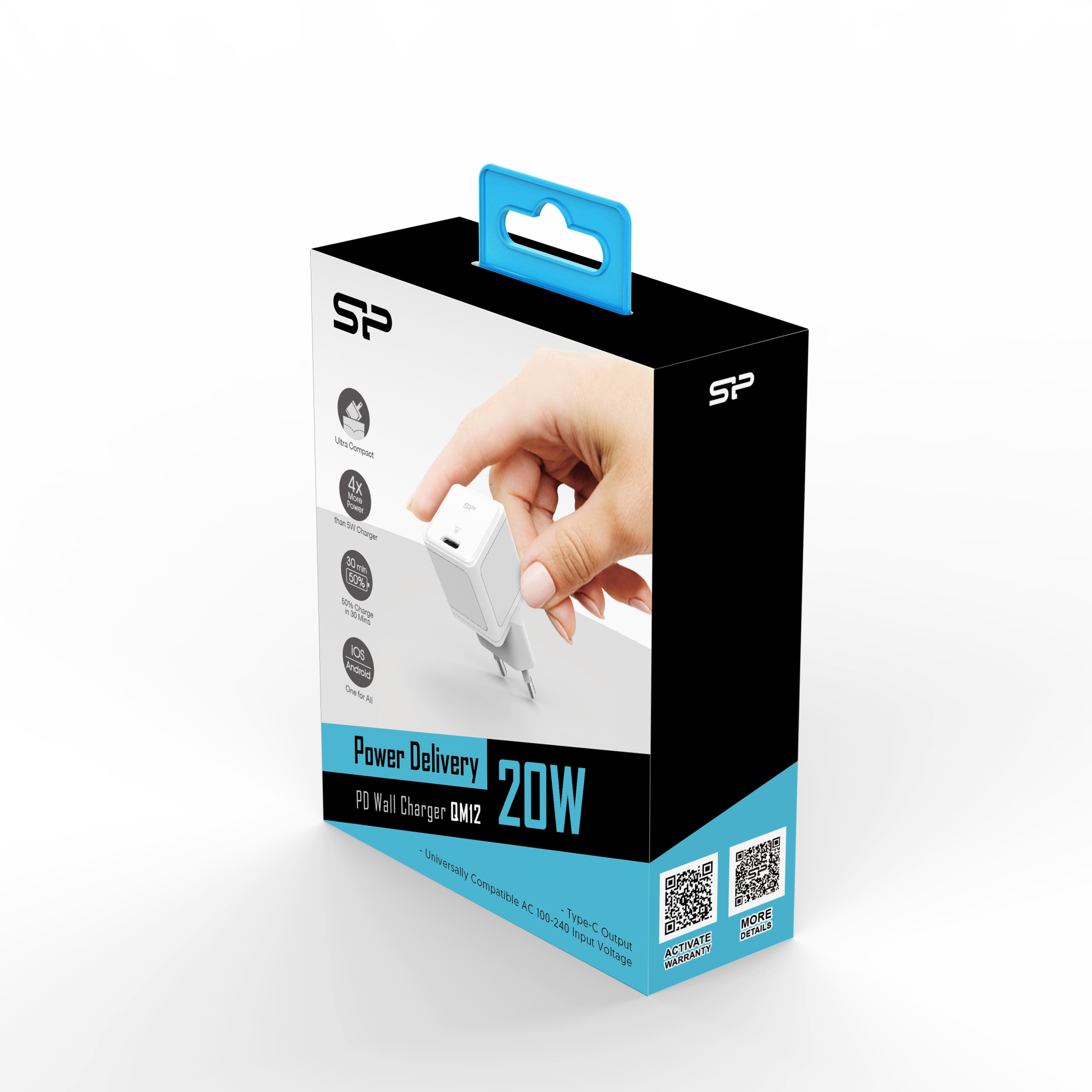 The QM12 wall charger from Silicon Power is a unique combination of small device size and high charging power. It is 50% smaller than standard chargers and provides up to 20W of charging power. The device is equipped with a USB Type-C Port, which ensures compatibility with most devices.