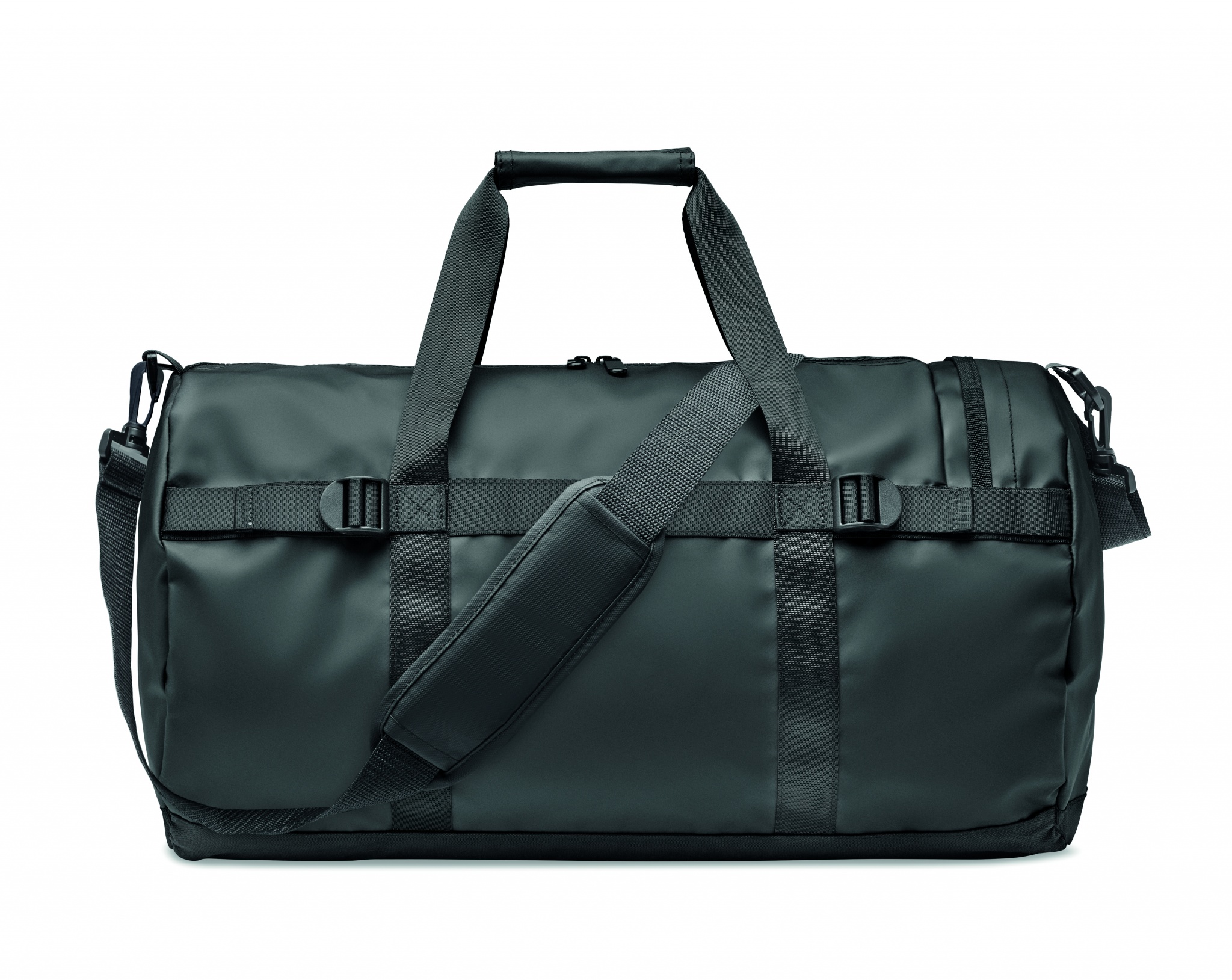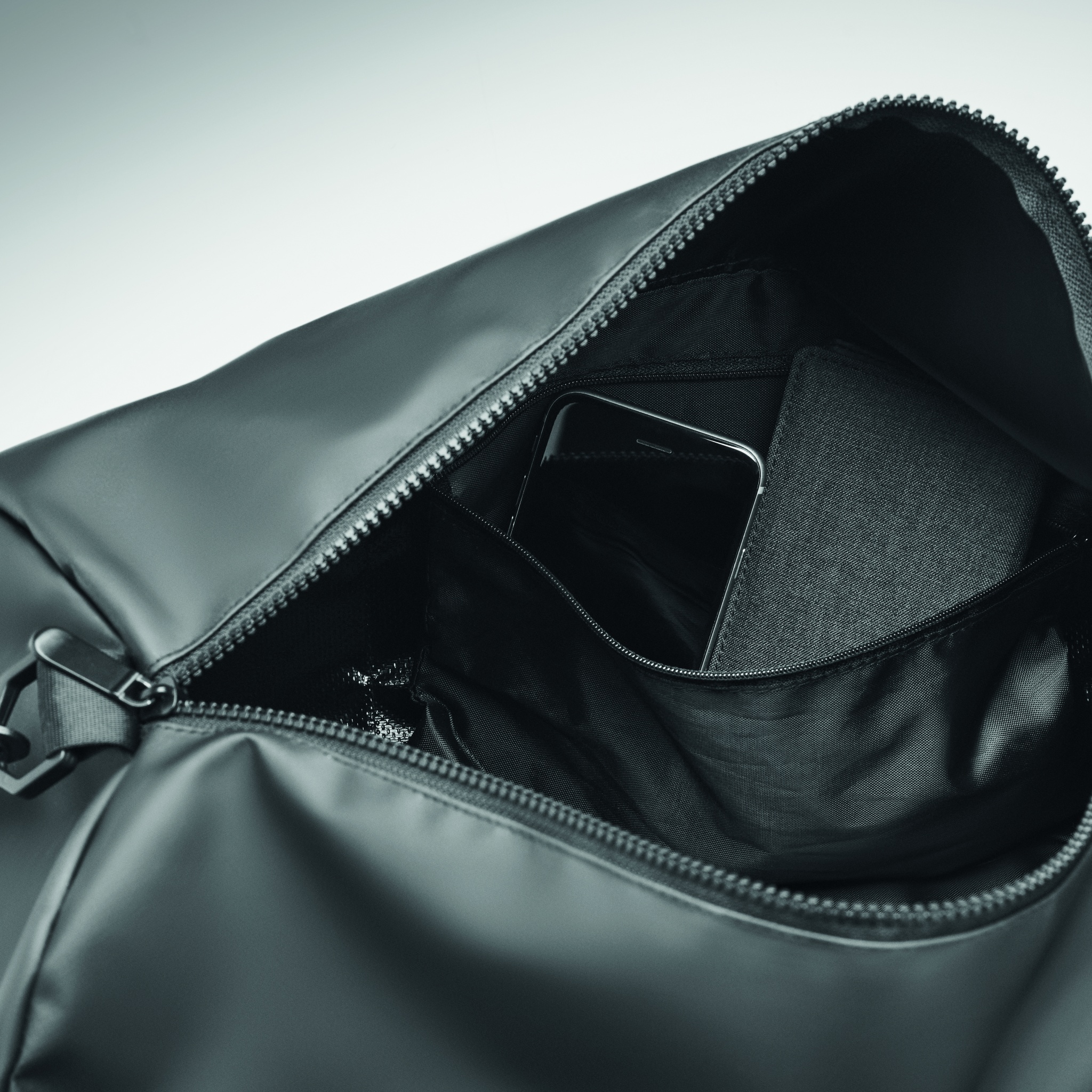 Duffle bag, sports or travel bag in 50C tarpaulin with zippered side compartment and zippered inner pocket. It has a comfort grip handle and padded base.