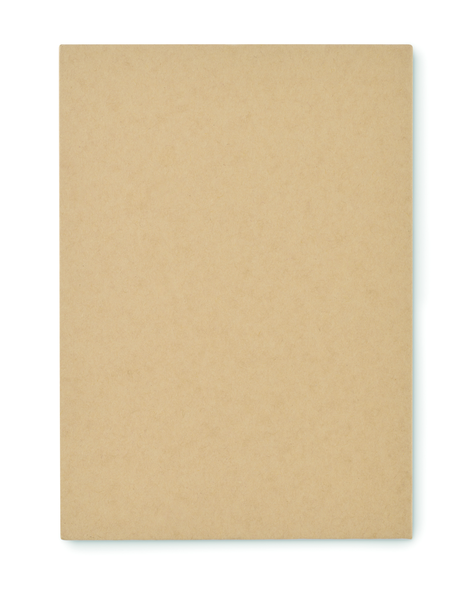 Stationary notepad set with recycled carton cover. 70 lined recycled sheets. Sticky memo pads and page markers. Push ball pen with paper barrel and ABS parts, ABS sharpener, 2 wooden pencils, 15 cm wooden ruler, and PP protractor.