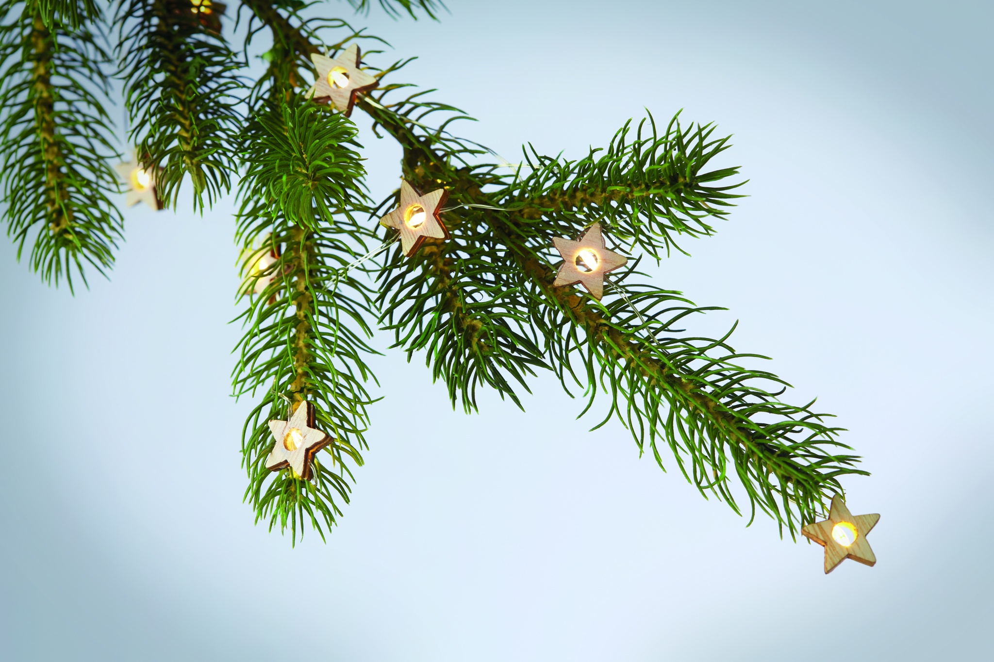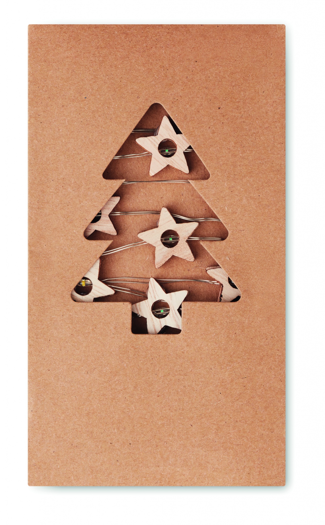 String with 20 LED lights in wooden star shape. Presented in carton box. 2 AA batteries not included. On/off button in battery case.