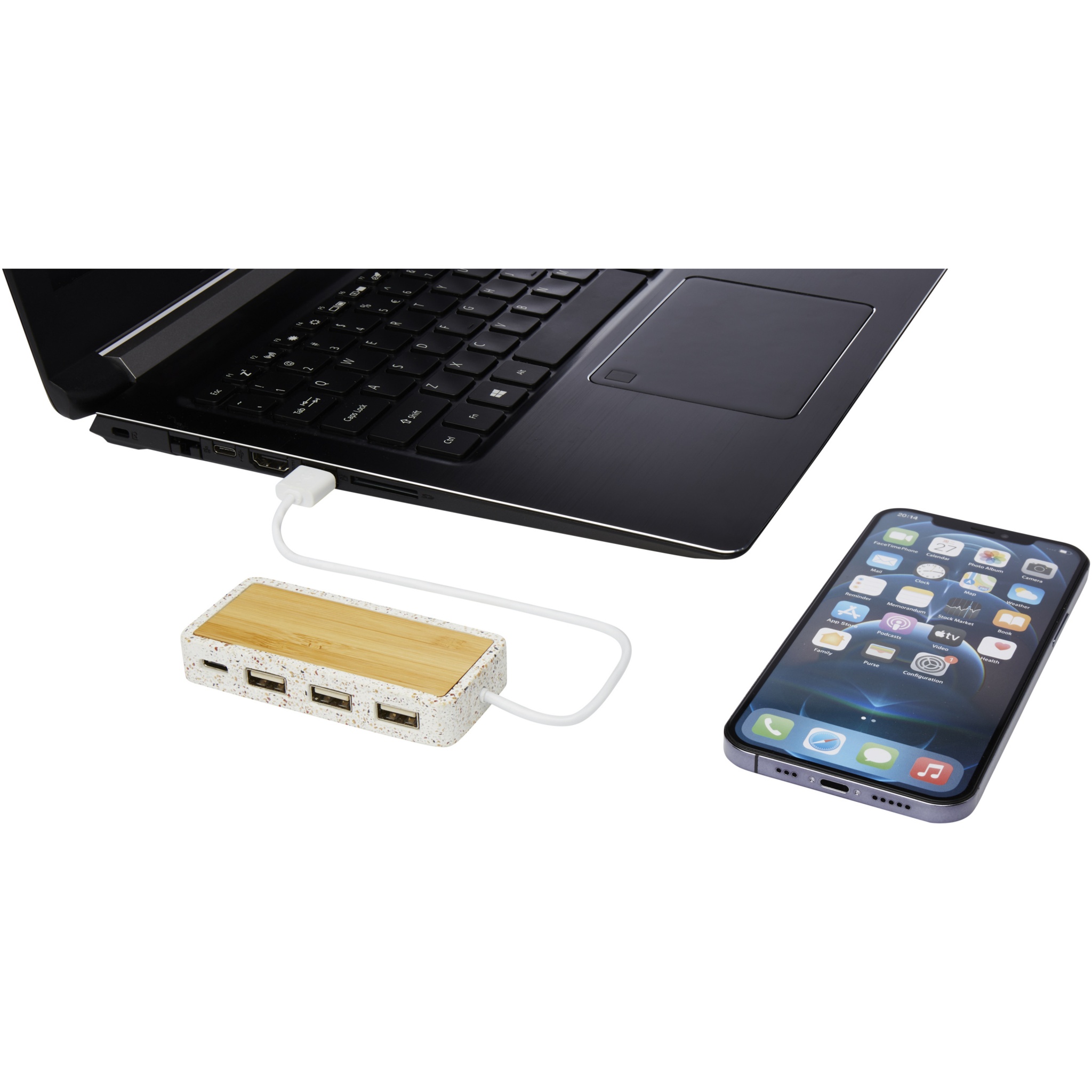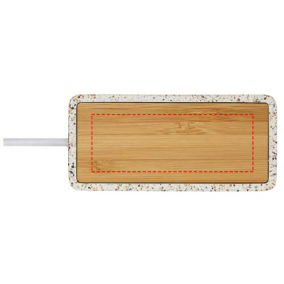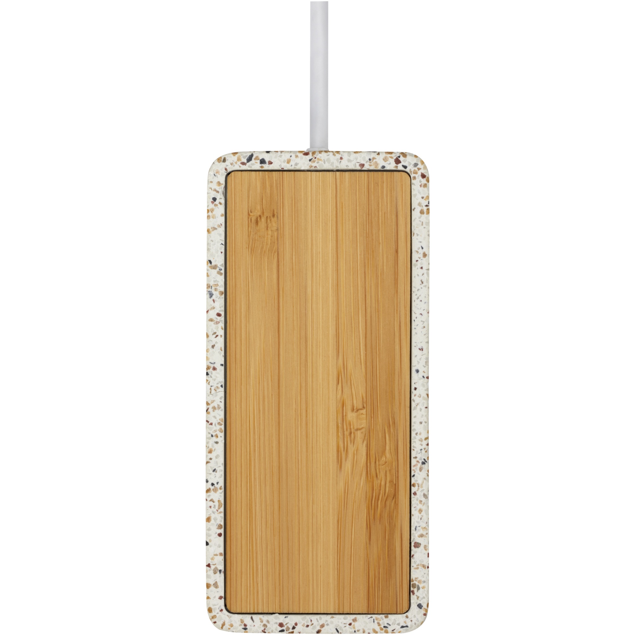 USB 2.0 hub made of a combination of natural terrazzo and bamboo. Includes 1 Type-C and 3 USB-A outputs. Delivered in a gift box with an instruction manual (both made of sustainable material).
