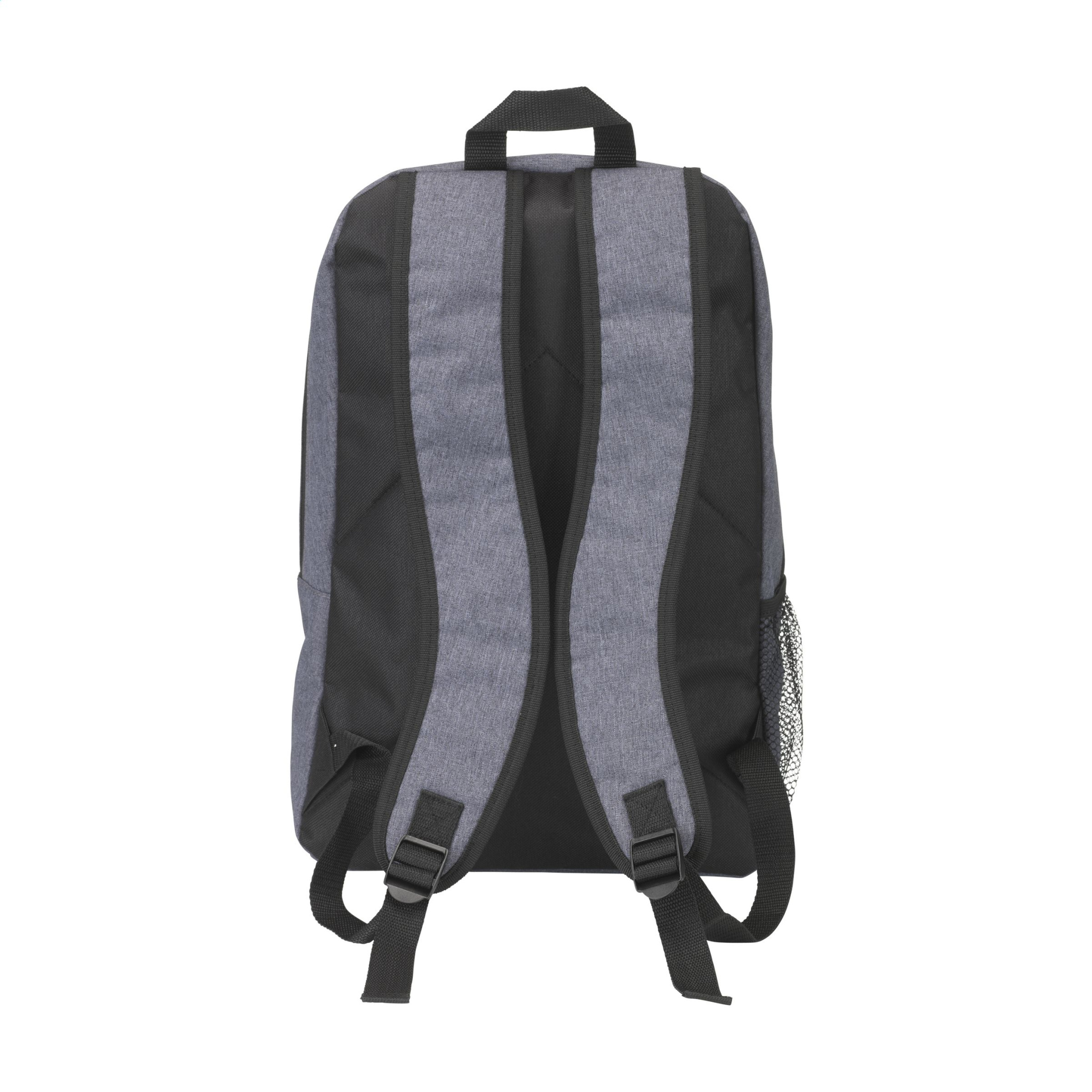 Backpack made from 600D/300D polyester. With royal main storage, front pocket with zipper, mesh pocket, adjustable, padded mesh shoulder straps, padded backside and hanging loop.
