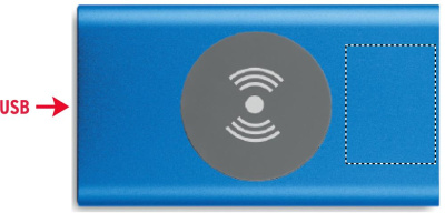 Wireless aluminium charging power bank with 4000 mAh capacity. Includes Type C connector. Output: DC5V/0.8A. Compatible latest androids, iPhone® 8, 8S and X and newer.