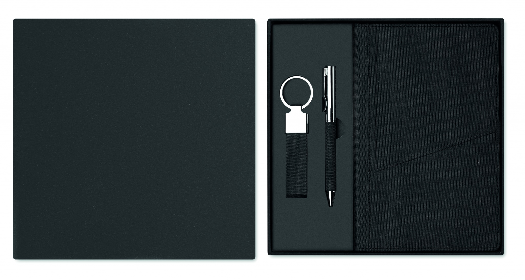 3-osaline kinkekomplekt kinkekarbis. Kaasa arvatud metallist keerduv pastapliiats RPET polüesterdetailidega, RPET kõvakaaneline sülearvuti eesmise nutitelefoni taskuga ja RPET polüester võtmehoidja. Sinine tint.