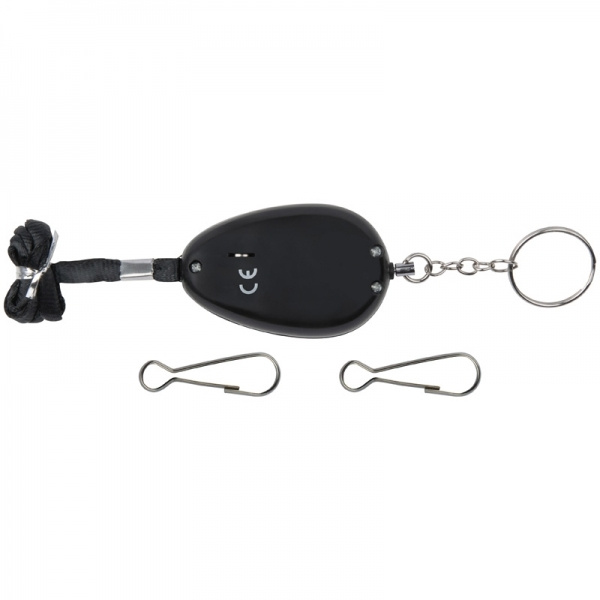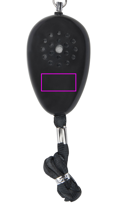 Tasku alarmi saab aktiveerida, tõmmates lihtsalt võtmehoidja tihvti välja. Tänu kahele kaasasolevale turvakonksule saab selle kinnitada peaaegu kõikjale. Sisaldab musta pingutusnööri ja kolme LR45 nööpelementi. Trükime teie logo ühele küljele.