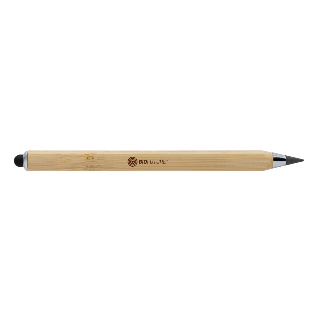 Moodne lõpmatuse pliiats, mis on valmistatud FSC® 100% sertifitseeritud bambusest. Kolmnurga kujuline korpus, ühel küljel CM-tähis ja teisel küljel tolli. Traditsioonilised puidust pliiatsid kirjutavad ainult kuni umbes 200 meetrini, kuid selle Tree-vaba lõpmatuse pliiatsi pikkus on kuni umbes 20 000 meetrit, kasutades grafiidist joont. See mitte ainult ei kirjuta nagu pliiats, vaid ka märgiseid saab kustutada. See toimib nii, et jätab paberile grafiitjoone nagu tavaline traditsiooniline puidust pliiats, kuid kulub nii aeglaselt, et peaks vastu kuni 100 traditsioonilist puidust pliiatsit! Puutetundliku otsaga mobiilseadme kasutamiseks. Pakitud FSC® segupakendisse.