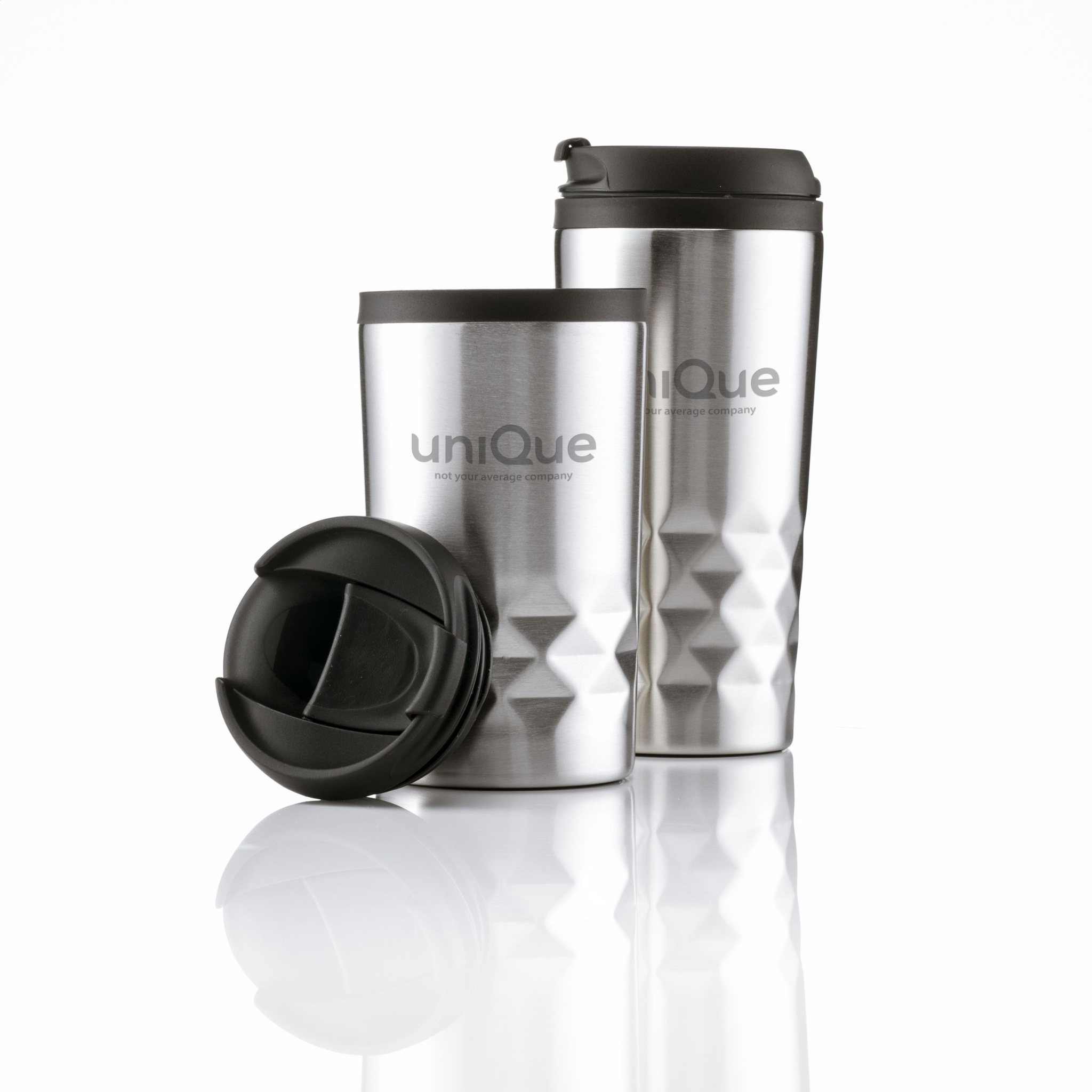 Topeltseinaline, lekkekindel roostevabast terasest termotass keeratava korgiga, klõpsava. PP sisesein. Hoidikul on iseloomulik 3D geomeetriline teemantmuster. Libisemiskindel alus. Mahutavus 300 ml. Iga ese on eraldi karbis.