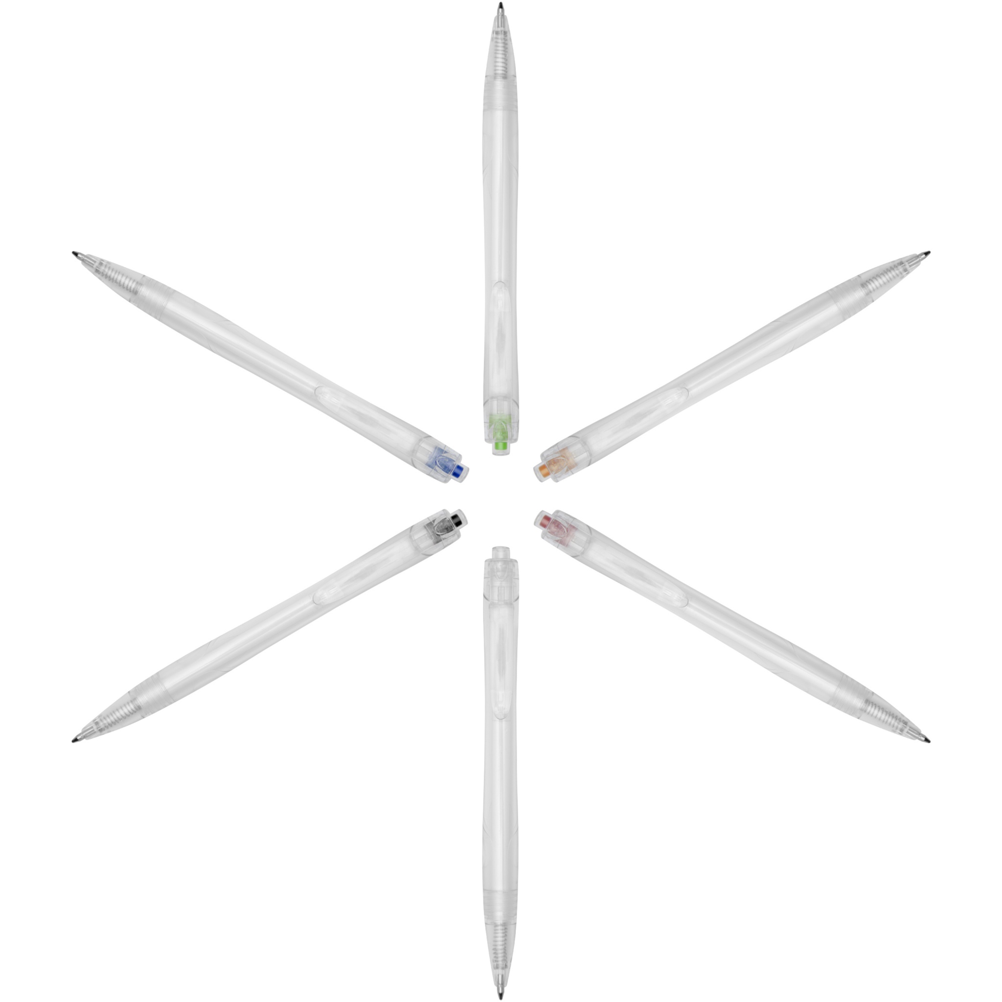 Click action pastapliiats, mis on valmistatud taaskasutatud PET-st, vähendades esmase plasti kasutamist. Pastapliiatsil on läbipaistev toru ja värviline nupp. See on eellaaditud sinise täidisega ja seda saab kombineerida 107763 Honua RPET sülearvutiga.