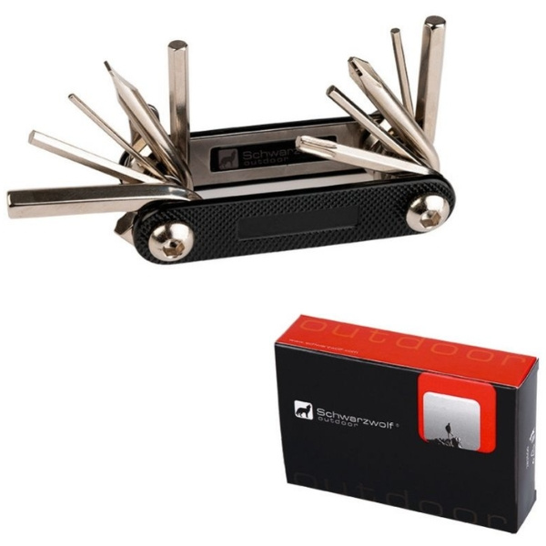 Praktilised tööriistad jalgratturitele. Sisaldab rattaparanduse multitööriista. Pakitud Schwarzwolfi karpi.