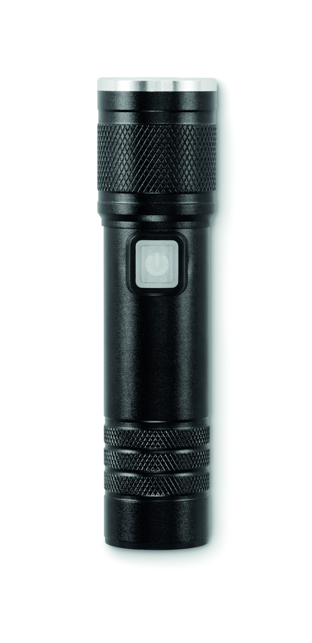 Musta värvi laetav ja pikendatav COB-valgusega taskulamp taaskasutatud alumiiniumist. 100 luumenit, 3 valgusseadistust ja suumimisfunktsiooniga. Sisseehitatud 800 mAh laetav aku. Laadimiskaabel on kaasas.