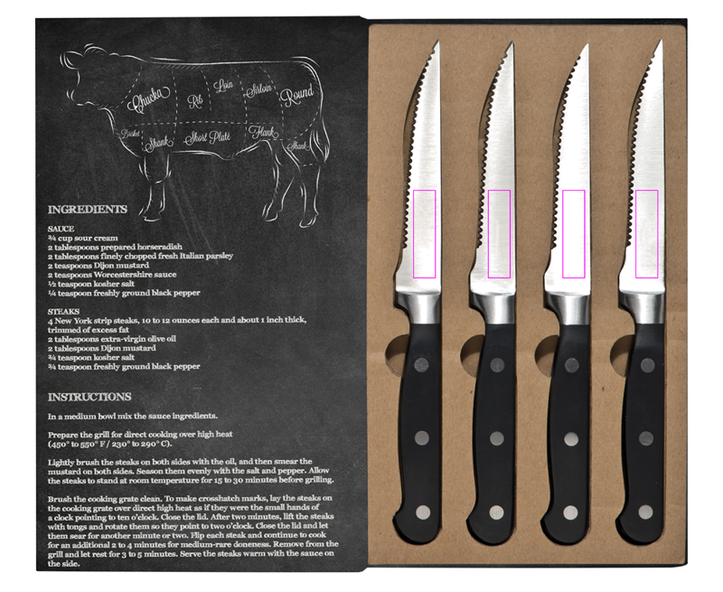 Lugu lihast! Täiusliku steigi jaoks vajate ideaalseid nuge, vastasel juhul näeb teie praad enam-vähem välja nagu hakkliha. See steigi nugade komplekt on valmistatud roostevabast terasest ja kvaliteet on lihtsalt suurepärane. Pakkimine muudab komplekti veelgi paremaks. Trükime teie logo pakendile tampooniga.