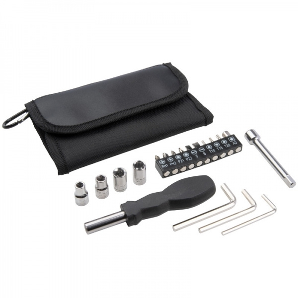 Tööriistakomplekt koosneb erinevate mutrite ja otsikutega kruvikeerajast, pikendusosast ja kolmest erinevas suuruses kuusnurksest võtmest ning praktilisest haakekonksudega kotist, kuhu trükime Teie logo. Komplekt on eraldi pakitud polükotti.
